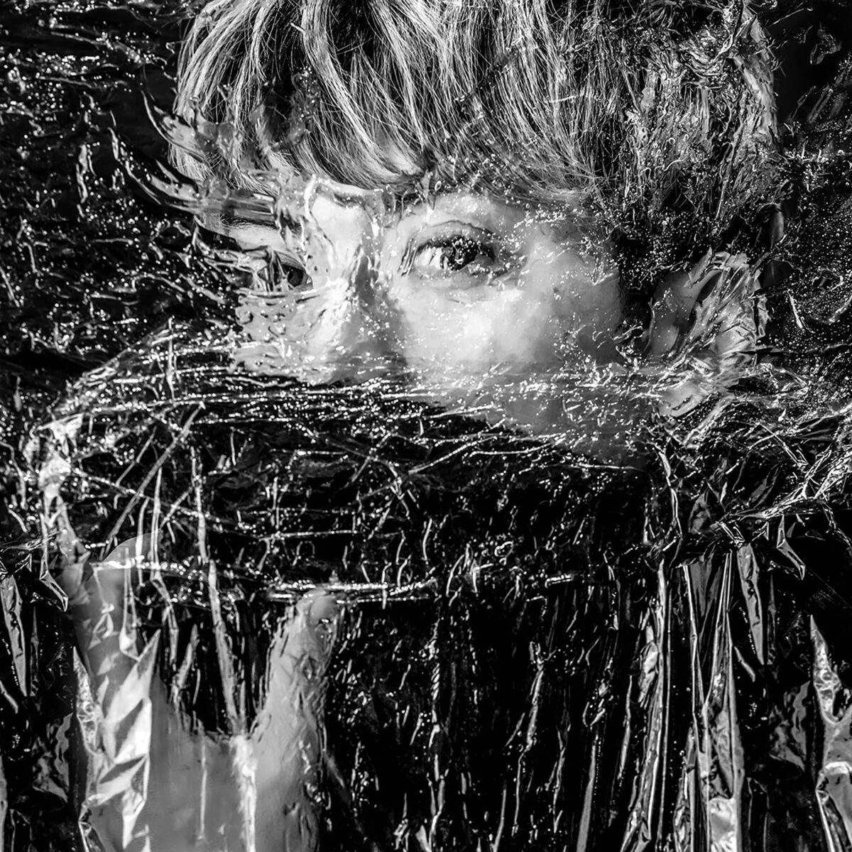 Layering contemporary society with portraiture, the work reveals the invisible layers within us. Words from the pandemic cling to acrylic; light fractures and faces blur — a silent trauma.