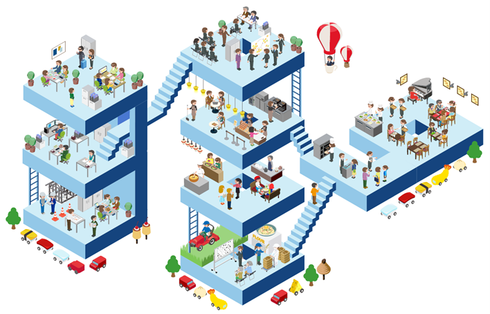 サンマルクグループの企業理念である「私たちはお客様にとって最高のひとときを創造します。」の実現に向けて、さまざまな業務に従事する従業員の方々の様子を温かみのあるイラストマップで表現しました。