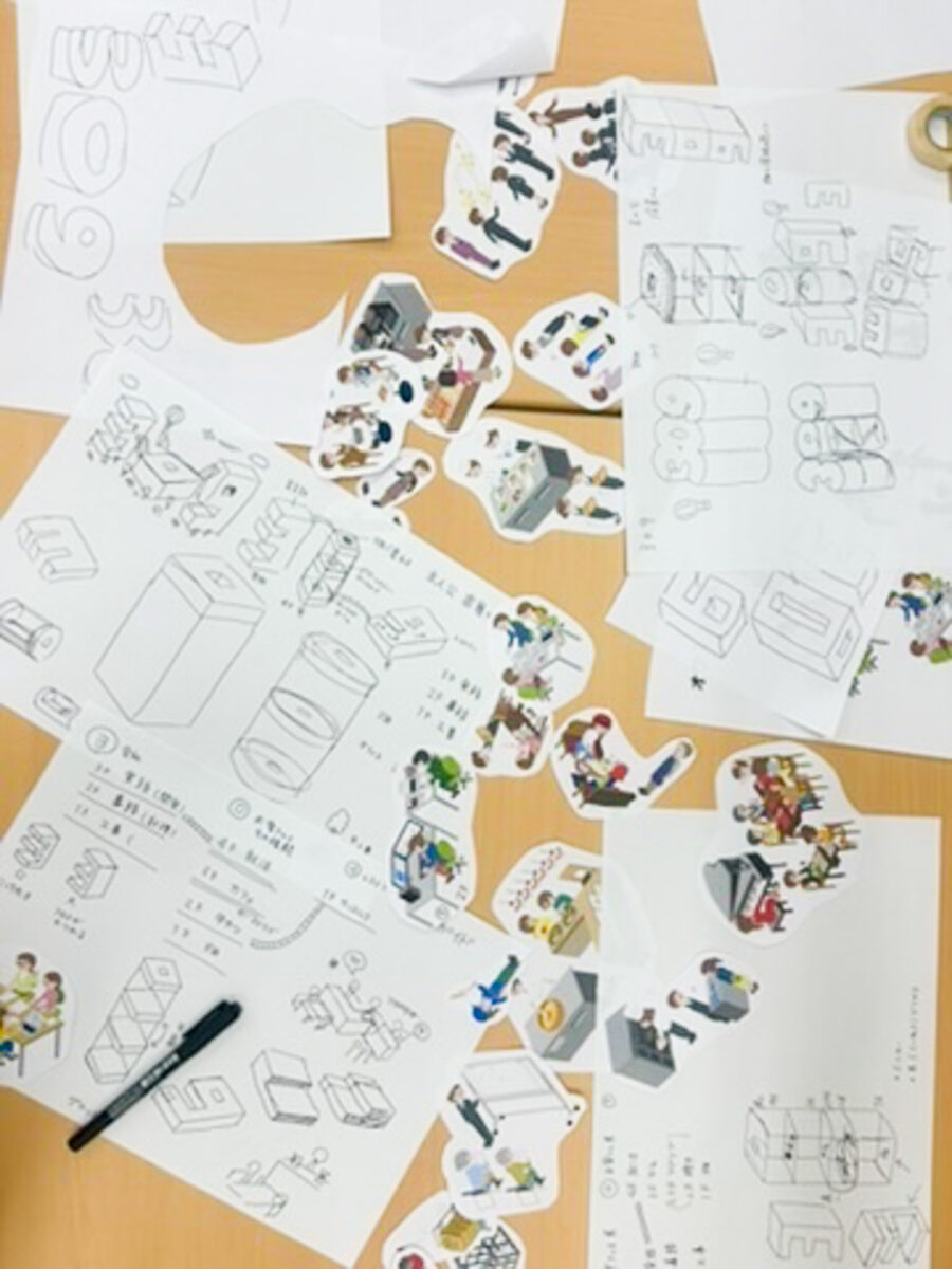 デフォルメ化された建物や人々のイラストを楽しみながら、お客様と直接出会うことはない、たくさんの“裏方”の存在を知っていただけたらと思います。