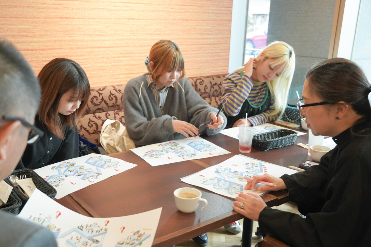 イラストマップを制作した学生は実際に店舗を取材し、そこで働く人々や室内の什器までできる限り丁寧に再現しました。実は、マップの中には社長の藤川氏も。ぜひ、親しみやすいサンマルクグループの雰囲気を感じていただけたら幸いです。