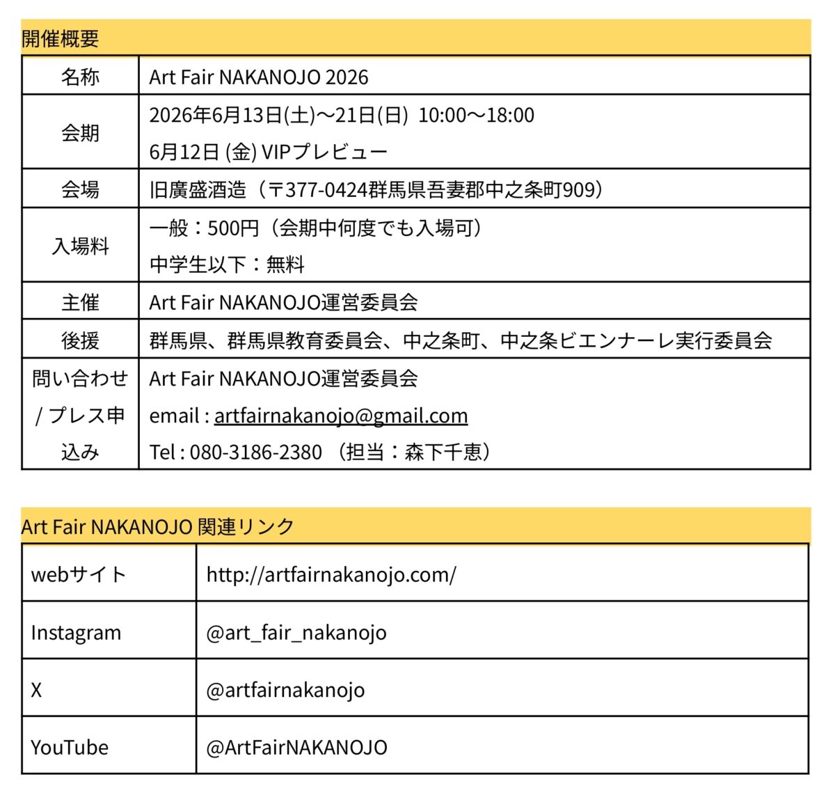 Art Fair NAKANOJO運営委員会は、2026年6月13日(土)〜21日(日)まで、群馬県中之条町の旧廣盛酒造にて、アーティスト主導によるアートフェア「Art Fair NAKANOJO 2026」を開催いたします。