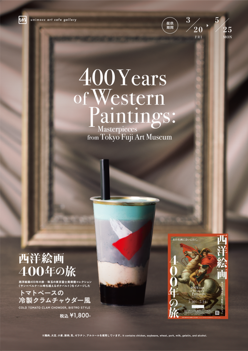 アートカフェunimocc(ユニモック)(株式会社TSUDA CONSTRUCTION COMPANY運営)は、この度、3月20日より京都市京セラ美術館にて開催される『⻄洋絵画400年の旅―珠⽟の東京富⼠美術館コレクション』https://www.ktv.jp/event/seiyoukaiga400/)とのタイアップ商品となる『飲む名画』シリーズの新ドリンクを期間限定で販売いたします。