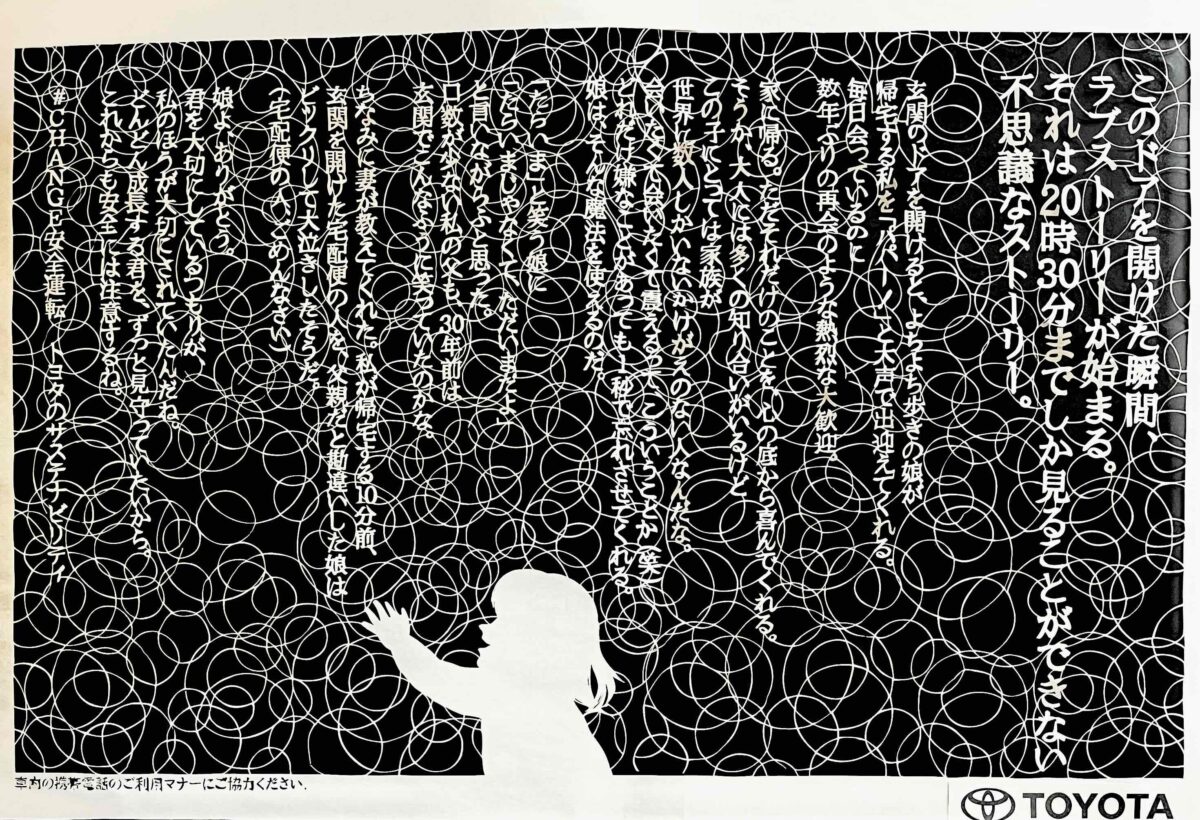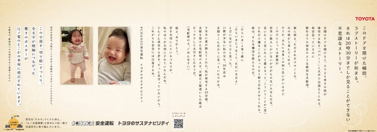 広告内には二次元コードを掲載。読み取ると、動画「玄関あけたらラブストーリー」を視聴することができます。通勤や通学、旅の途中でふと目に留まる“静”の切り絵から、家族のもとへ帰る歓喜を描いた“動”の映像へ。広告を見る体験そのものが、安全運転を自分ごととして考えるきっかけになることを願っています。