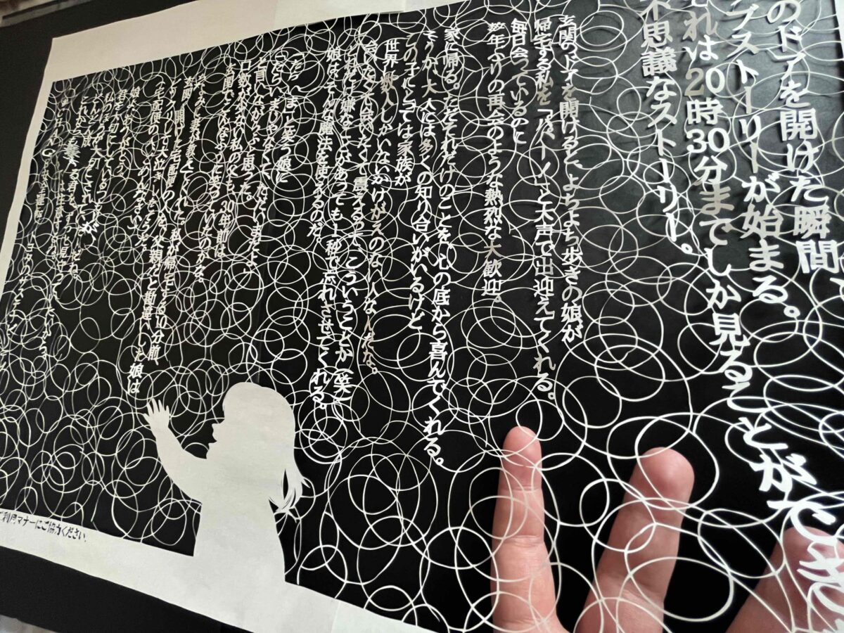 この切り絵コンセプトは 「安全安心な日常は、切り絵のように奇跡的につながっていて、それが途切れないように」 ということですが、 本当にその通りだと思います。地震や豪雨を経験して、 日常はある日突然なくなるものだと、解体が進んだ故郷を見てて強く共感できます。