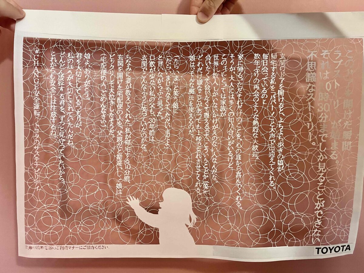 今回、その想いをより身近な場所で届けるため、516文字の切り絵アートを用いた交通広告を期間限定で掲出します。毎日の通勤やお出かけの途中で、奇跡的につながっている驚きの表現を通じて、安全運転の重要性を改めて考えてもらうことを目指しています。