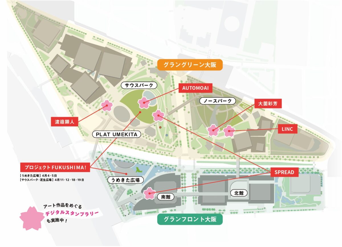 会期中は、桜や多様な植物、開放的な空間が広がるうめきたエリアの各所で、6組のアーティストによる作品を展開します(鑑賞無料)。両施設のそれぞれの玄関口には、クリエイティブ・ユニット SPREADによる巨大なカーテンを思わせるインスタレーション作品が現れ、来街者をお迎えします。さらに、人々が集う芝生広場・うめきた広場では、プロジェクトFUKUSHIMA!による最大50m×30mの「大風呂敷」が登場するほか、エリア内各所のパブリックスペースでスケール感のある作品をご覧いただけます。あわせて、展示作品を巡りながら楽しめるデジタルスタンプラリーや、飲食店舗と連動したテイクアウトキャンペーン、歩道へのオリジナルベンチ設置なども実施し、作品鑑賞にとどまらない「ピクニック」にふさわしい体験機会をご提供します。