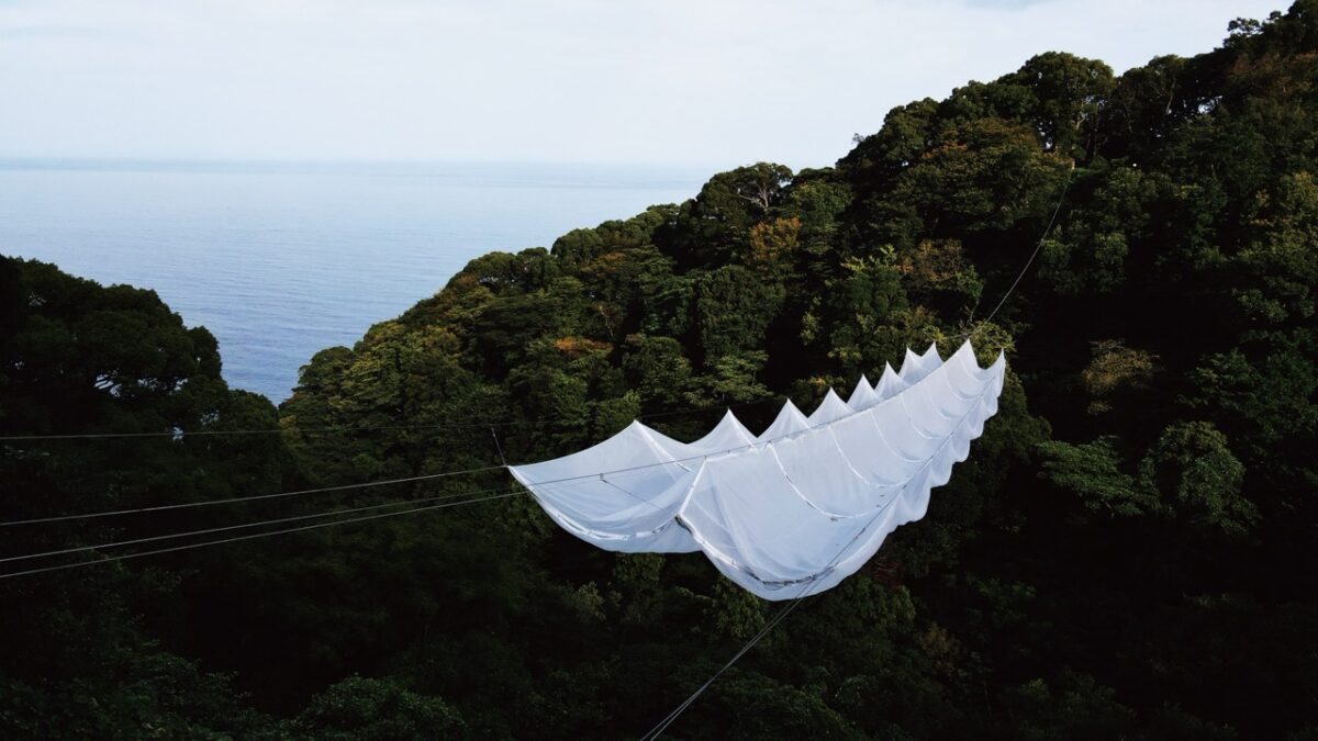 作品概要:ゲートランタンの特徴的な螺旋の階段にロープを掛けていくことで空間を可視化させる作品を展示します。DNA構造も想起させる螺旋の中心には、生命を象徴するように繭が光を放っています。エスカレーターや階段を上下しながら空間の中に入り込み、風や光、構造の広がりを体感ください。