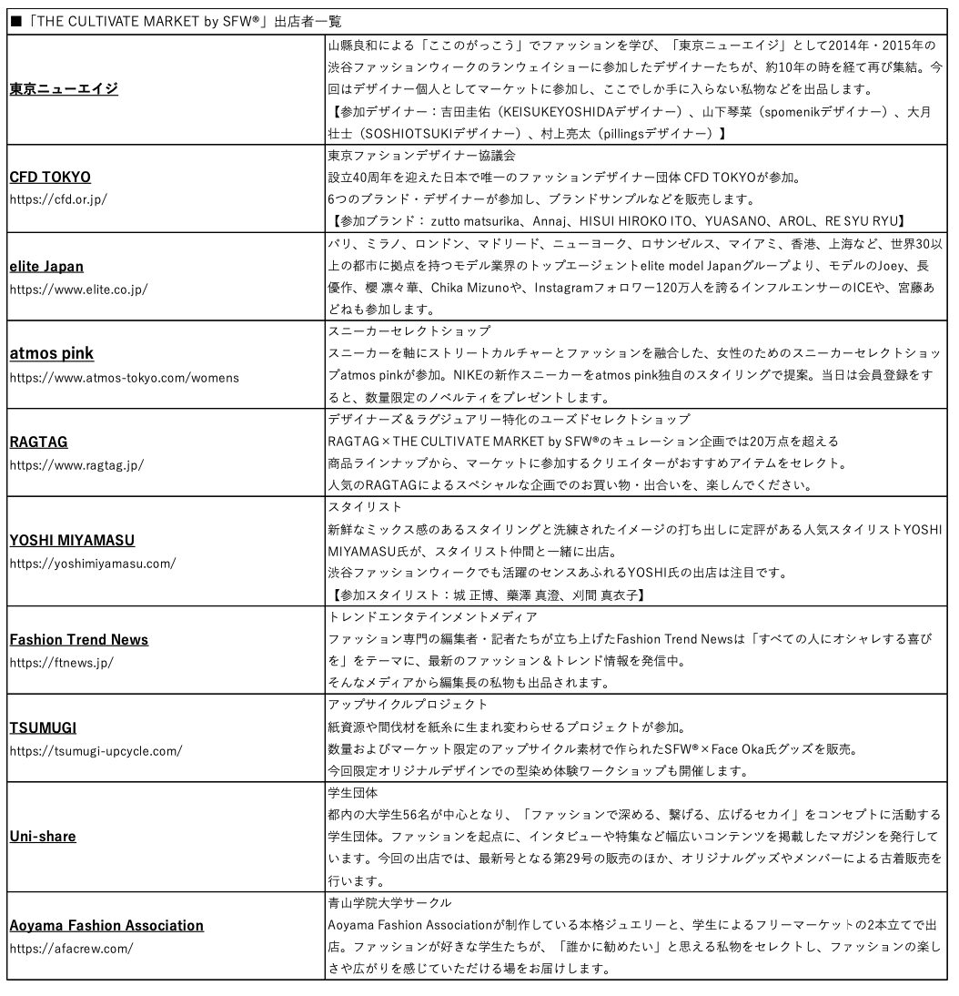 「THE CULTIVATE MARKET by SFW®」は、渋谷ファッションウィークがこれまでの13年の歴史で積み重ねてきたネットワークを活かし、渋谷ファッションウィークのランウェイショーに参加したファッションデザイナーやインフルエンサー、スタイリスト、ブランド、学生サークル、日本で唯一のファッションデザイナー団体CFD TOKYOやアップサイクルプロジェクト「TSUMUGI」など、多様な分野で活躍する顔ぶれが出店します。会場では、出店団体の想いが詰まった私物やTシャツ、アクセサリーなどのファッションアイテム、グッズなど、ここでしか出合えない商品が並び、単なる物の売買にとどまらず、会話が生まれ価値観が交差しヒトモノコトが出合い、訪れる人も自然と仲間になっていくような関係を育てる場を目指します。