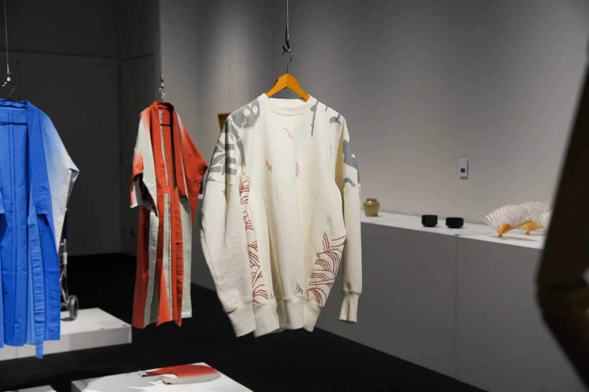 作品概要: 和装花嫁衣装の装飾技法「金彩」を施した、家庭での洗濯も可能なスウェットシャツ。
