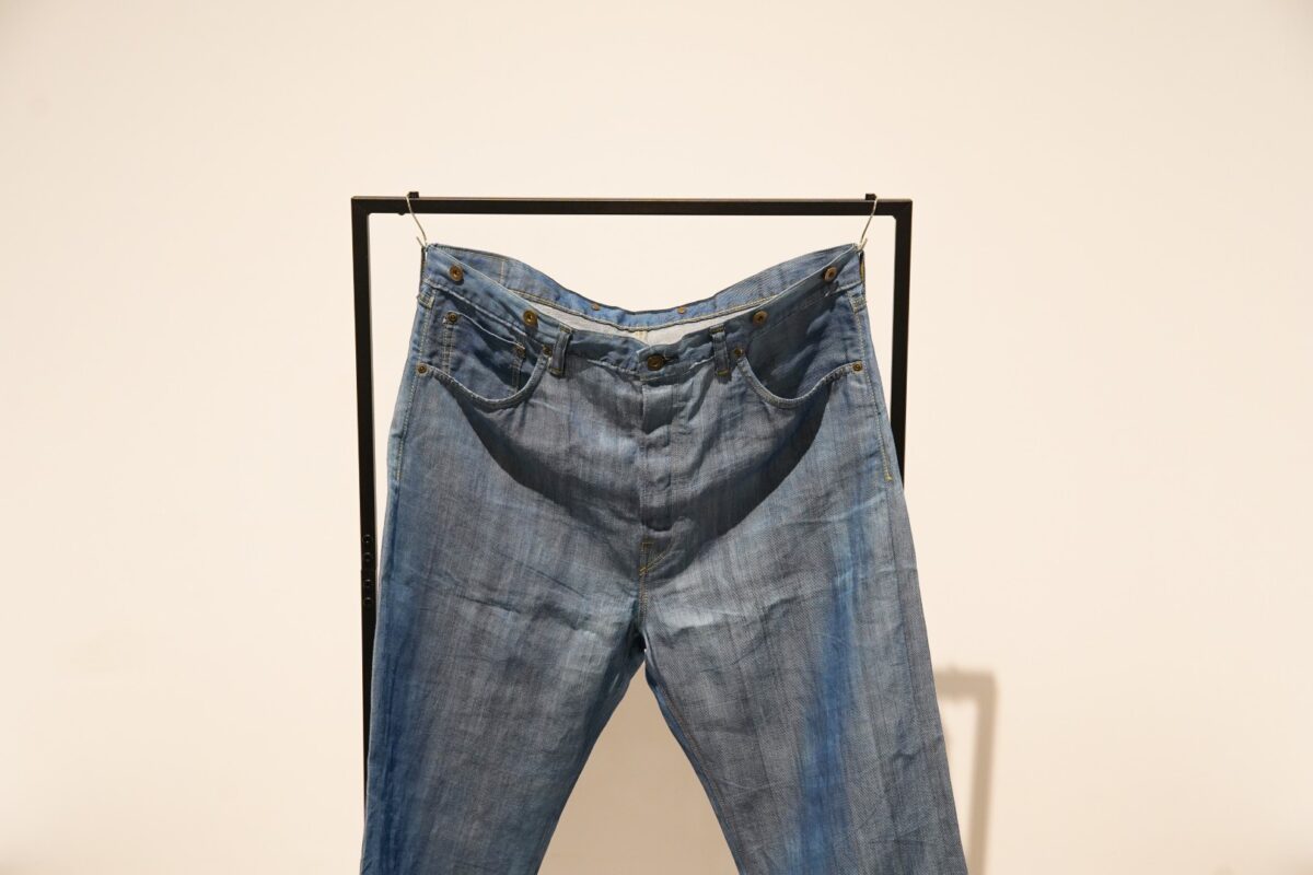 作品概要: 沖縄の伝統的織物(ラミー/苧麻)を用い、琉球藍や天然染料で染め上げたジーンズ。