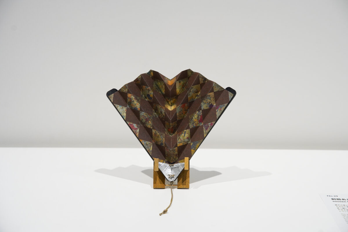 作品概要:扇骨(中骨)を使わない独自の構造で、扇ぐ道具としても飾り扇としても楽しめる新しい形の扇。