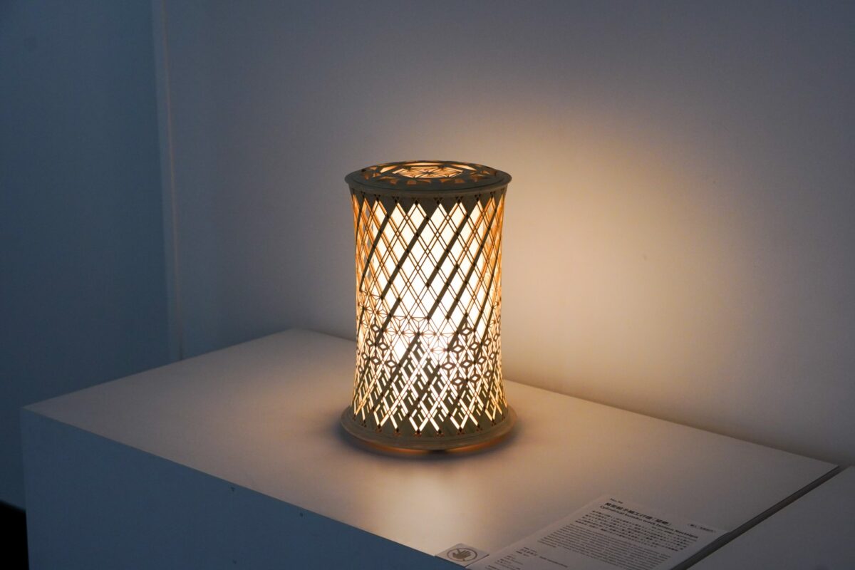 作品概要: 従来は四角形や多角形が主流の組子細工を、試行錯誤の末に筒型へと組み上げた行燈。二重菱(にじゅうびし)などの伝統柄を組み合わせ、故郷の山並みを表現しています。