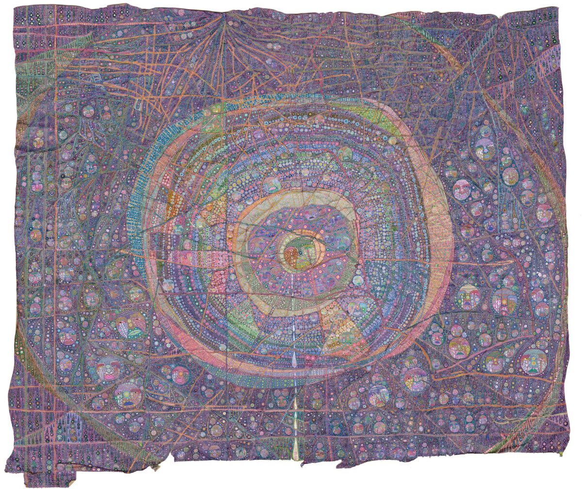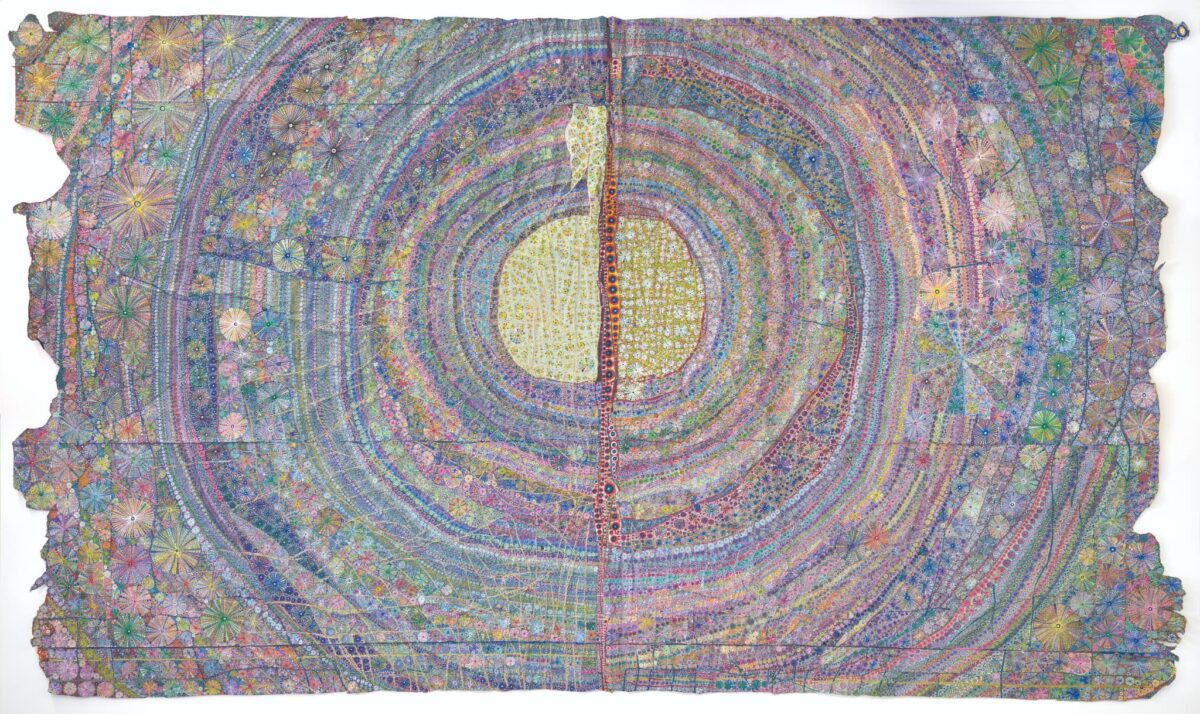 浅野氏は、米袋を支持体に用い、シワや破れなどの素材が刻んだ痕跡をも作品へと昇華させながら、緻密なドローイングで唯一無二の世界を描き出すアーティストです。《ヒョウカ》は、「評価されたい」という、ひとりの人間の純粋で切実な感情から生まれました。満月の夜のサンゴの産卵、星や月、生き物たちのイメージを纏いながら、無数の線と点が画面を埋め尽くしています。そこに立ち現れるのは、生命のエネルギーが脈打つ、宇宙を思わせる広大な風景です。本展では、《ヒョウカ》とともに、その誕生へと至る創作の軌跡を紹介します。自らと深く向き合い、エネルギーを画面へと注ぎ込み、一本一本の線を、一つひとつの点を重ねながら、ひたすら描き続けることで生まれた作品群です。