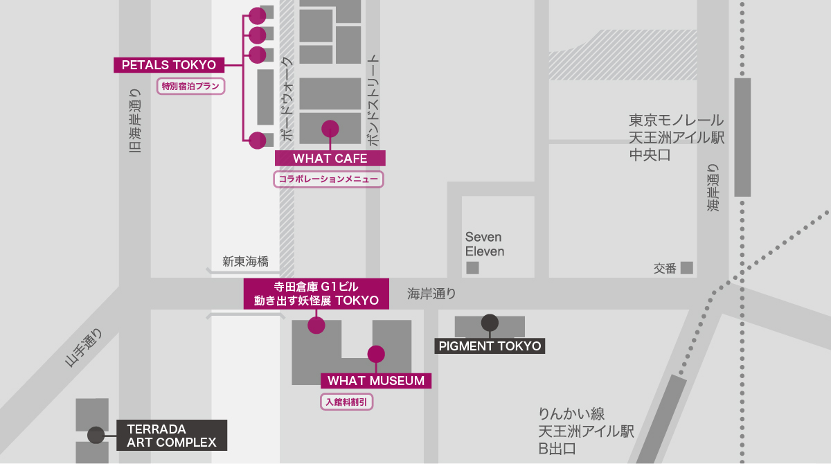 この度「動き出す妖怪展 TOKYO」にて、寺田倉庫運営施設であるPETALS TOKYO、WHAT MUSEUM、WHAT CAFEにて、同展覧会と連携した特別宿泊プランの販売や入館料割引、コラボレーションメニューの提供を実施いたします。展覧会とともにアートシティ天王洲をお楽しみいただけるコラボレーション企画が展開されます。