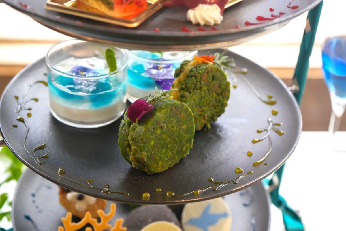AQUARIUM×ARTとして、アートといきものたちが共存する不思議な空間が魅力のアトア。その世界観をもとにホテルシェフが考案した4種類のセイボリーを取り揃えました。海に潜むカラフルな生きものたちをイメージしたアクアリウムサラダや、象徴的なフォルムのビーツ風味のラングドシャを飾ったスモークサーモンサンドなど、ほど良い塩味がアクセントのラインナップです。