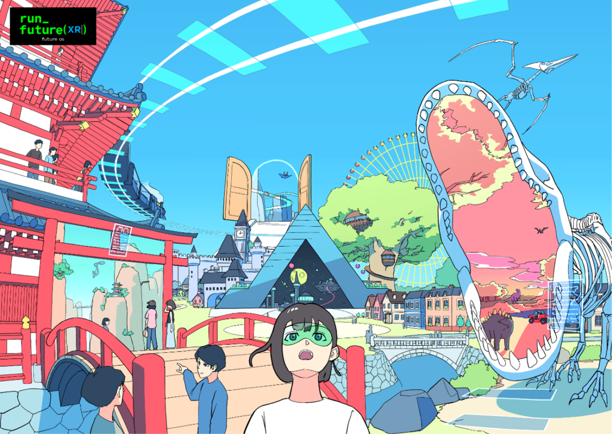 ジャンルを問わない幅広い表現力と、画面いっぱいに情報を詰め込みながらも心地よい躍動感を生み出すイラストレーター・赤羽ブギウギ氏を起用。ポップかつ大胆な構成力によって、XR技術が切り拓く多層的な体験世界、神話も宇宙も恐竜も同時に存在するテーマパークとしての風景を、体験者の視点から一枚絵として描き出しています。XR端末を覗くと、あらゆる世界への入り口が広がっているという次世代エンターテイメントのビジョンを、技術の解説としてではなく、はじめて異世界に触れた瞬間の高揚として可視化し、イラストと技術思想が交差するかたちで表現しています。