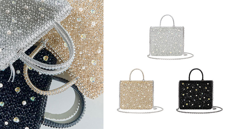 マルチカラーのビーズがランダムに装飾されたどこか遊び心のあるデザインの「GEMME(ジェンメ)」。こちらも間口にジッパーを付けたチェーンショルダーバッグタイプで登場。ユニークなカラーのシャンパンマルチと透明感が魅力のオーロラトラスパレンテの2色展開。