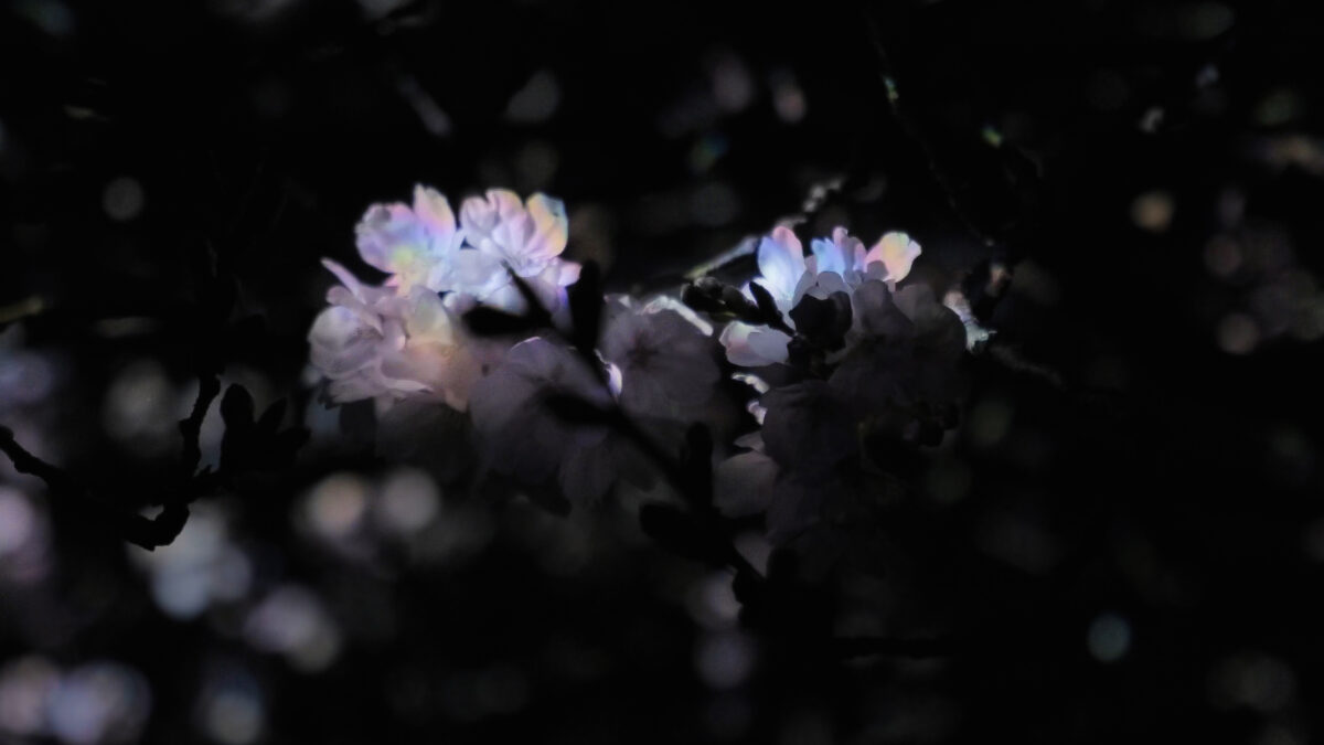《桜の結晶と桜の幽体》は、桜が咲き誇る数日間だけ、春の夜に結晶が浮かび上がるように輝く作品です。闇の中に浮かび上がり、沈み、揺らぐその輪郭は、生命が持つ「気配」そのものを空間に刻んでいきます。