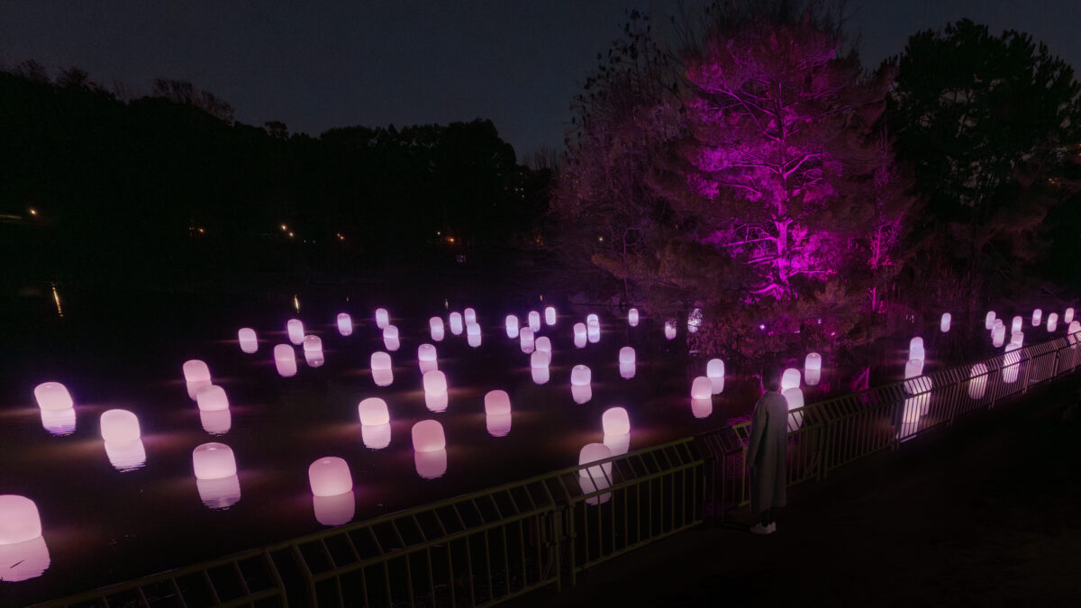 大池に浮かぶランプが桜色に光り輝き、変化していく。