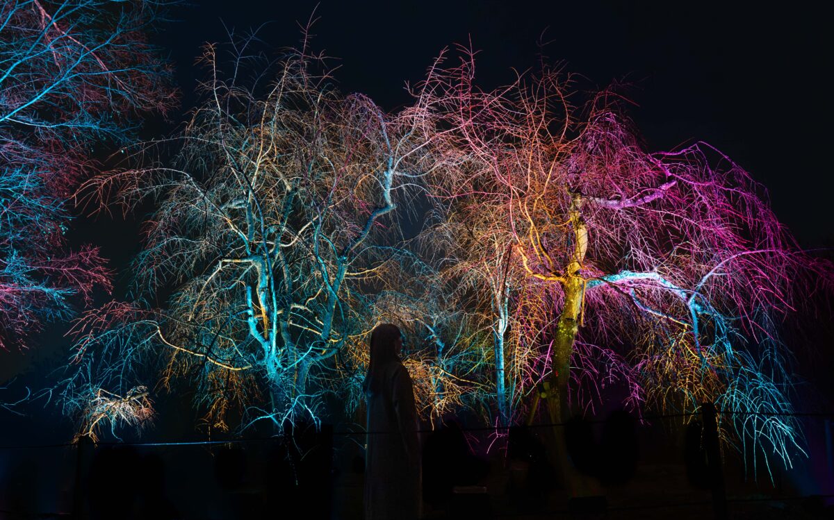 人々や動物が近くを通ると光を輝かせ、音色を響かせ、その周辺の木々も次々に呼応していく《呼応する木々 – しだれ桜》も桜に合わせた色で輝きます。