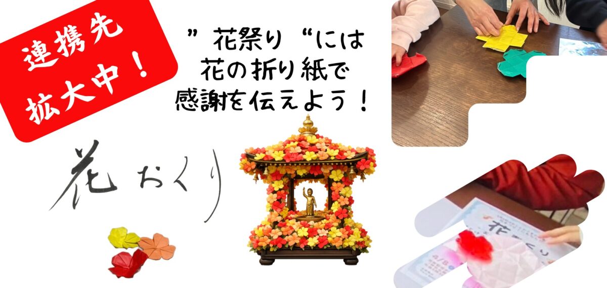 花祭り(灌仏会)に合わせ、折り紙の裏に感謝を書いて花の形に折り、花御堂へお供えする参加型企画「花おくり」が、地域・教室連携を拡大します。向日市観光交流センター「まちてらすMUKO」での子ども参加企画、ならびに継未書道塾 Kids Classの協力を得て、集まった折り紙は4月8日の法要で奉納し、その様子をYouTubeでライブ配信します(4月8日(水)17時30分開始)。