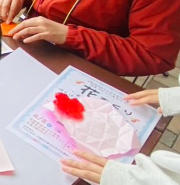 ① 地域連携(向日市):向日市観光交流センター「まちてらすMUKO」で開催される「てらすマルシェ&まーるハローワーク」と連動し、子どもたちが“お仕事体験”の一環として折り紙の花づくりに参加しました。今回は合計人数77名もの子どもたちに体験をいただけました。大学生の方々にもお手伝いいただき、活気ある職業体験の場づくりをいただきました。