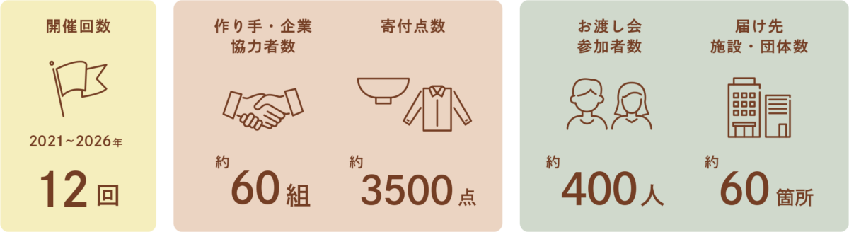 その後、株式会社マザーディクショナリーが運営面からサポート。活動に共感し、手を伸ばしてくださる作り手やブランドが少しずつ増え、思いのこもった器やお洋服を、さまざまな事情を抱えるこどもたちや若者へ手渡す活動へと広がっていきました。2020年からは、児童養護施設など社会的養護のもとで育ち、巣立ちの時期を迎えるこどもや若者へ向けた「うつわとお洋服のお渡し会」 を開催しています。これまでに約60組の作り手・企業から約3500点の器やお洋服を寄贈していただき、約400人の巣立ち前後のこどもや若者、約60箇所の施設や団体にお届けしてきました。
