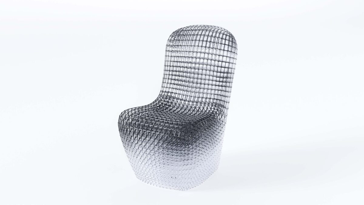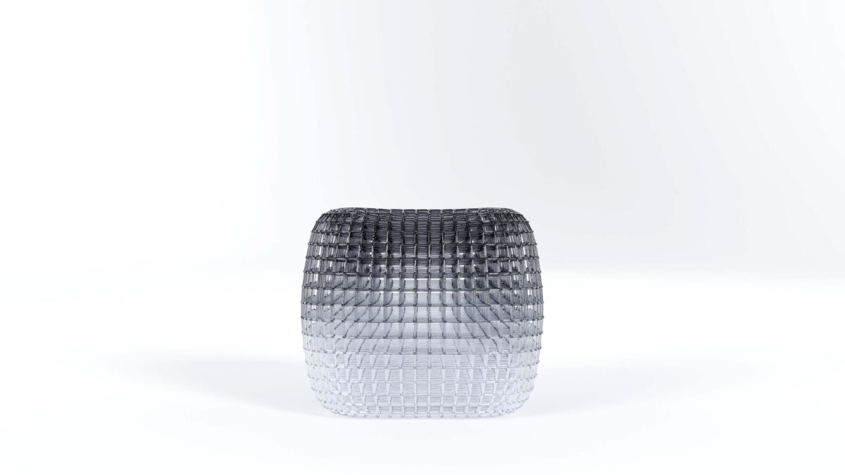 日常のなかで見過ごされがちな“存在の痕跡”を、透明な造形の中に留める試みである。椅子は本来、身体のための道具でありながら、同時に、身体が「そこにいた」ことを記録する媒体でもある。本作では、座面から立ち上がる黒い濃度が、体温や重さ、滞在時間の残像のように凝集し、下方へ向かって透明へと解けていく。そこにあるのは人物像ではなく、存在が空間へ滲み出た“影”であり、不在のなかに残る輪郭である。光を通す構造体が、見る角度によって密度と奥行きを変え、鑑賞者の身体感覚に「さっきまで誰かがいた」気配を呼び戻す。瞬間が記憶として蓄積されるように、身体の接触は痕跡として空間に編み込まれ、存在の連なりとして立ち上がる。