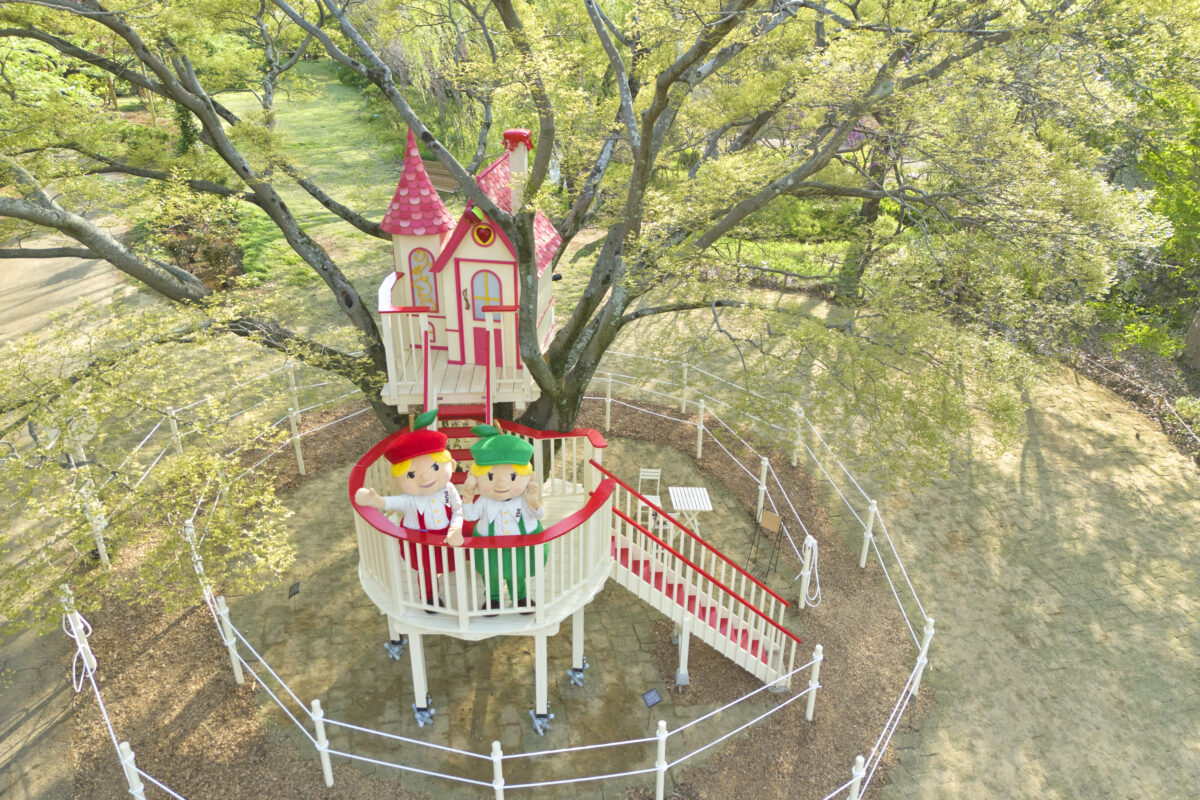 園内の池を見下ろす丘陵地のエリア「ポンドサイド」には、シンボルツリーである榎の木の上にツリーハウスならぬ「ツリーキャッスル」が昨年誕生しました。本アトラクションは地上約3.3mの高さにある、高さ2.5mほどの可愛らしいお城です。