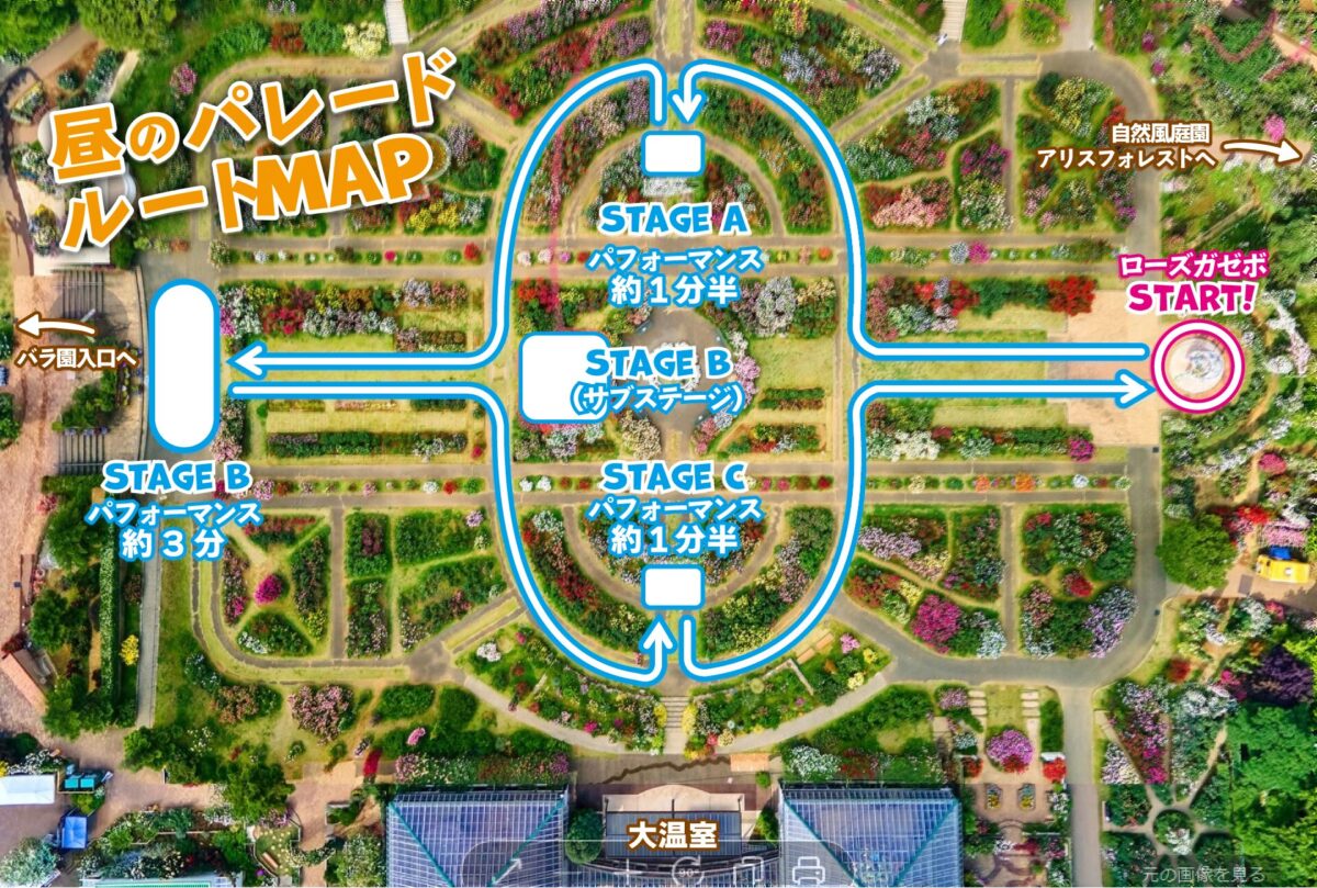 テーマパークでのダンスを学ぶ関東各地のダンス教室やスタジオ、市内のマーチングバンド名門校協力のもと、整形式庭園でパレードを開催。パレード曲は「不思議の国のアリス」をモチーフにした全12曲のメドレー形式で展開。りんご好きの双子の兄弟「ディーとダム」なども参加し庭園を盛り上げます。