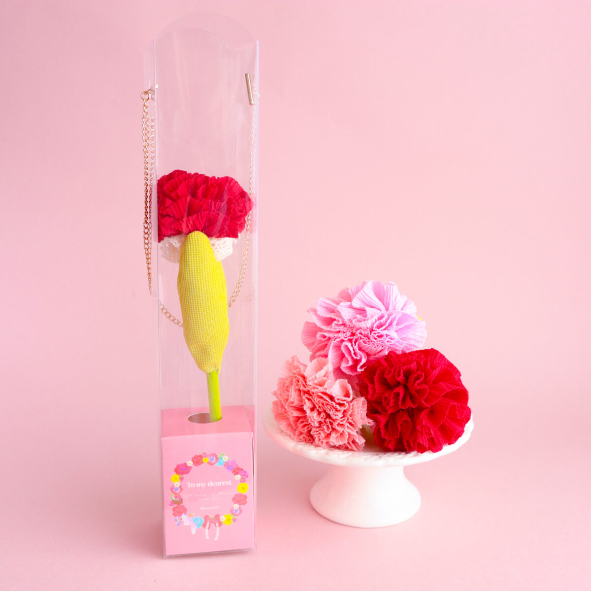 今年の新カテゴリーとして登場したのは、まるで本物のカーネーションのような、布で仕立てたフラワーアイテム。コラボデザインをあしらった、上品なゴールドチェーン付きのケースに収めることで、そのまま持ち運ぶことができ、思わずシェアしたくなるような可愛らしいデザインに仕上げました。普段はなかなか伝えきれない感謝の気持ちを、形に残せる新しいお花として、母の日に贈りませんか?