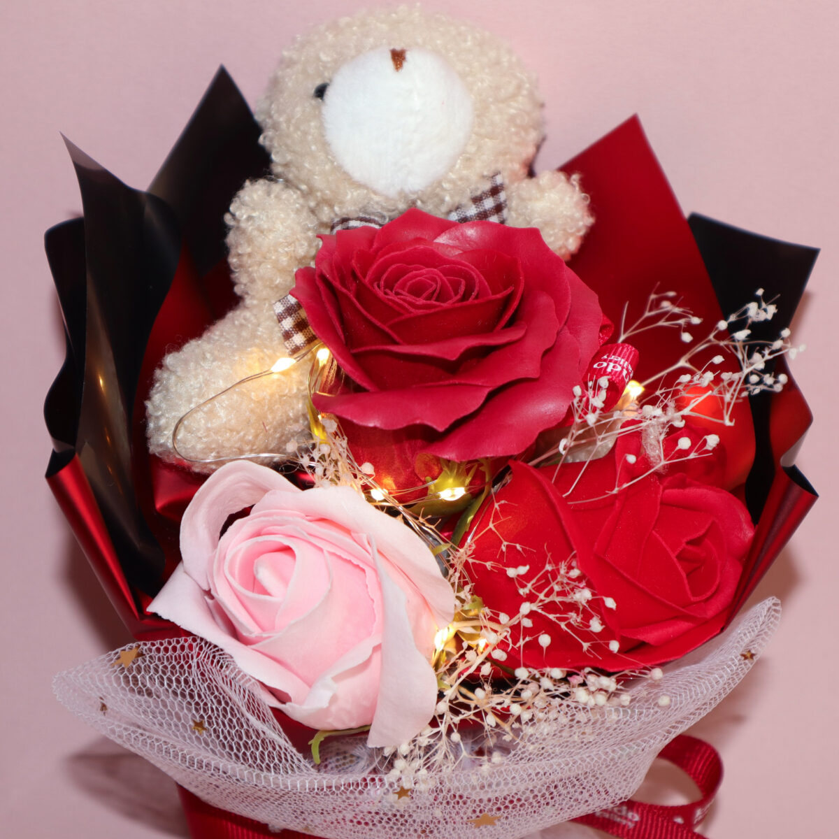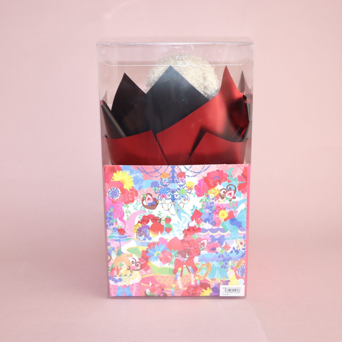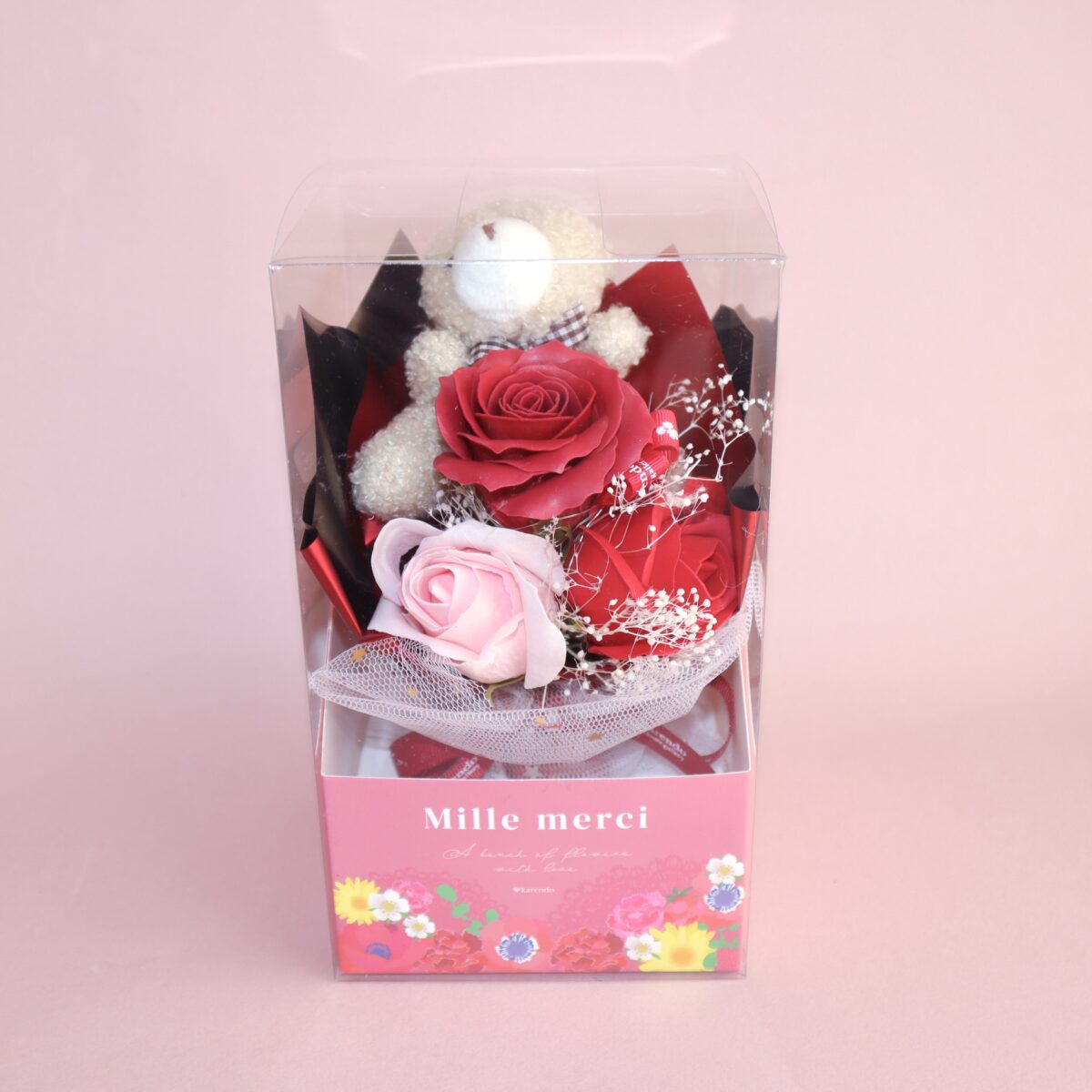karendoで通年人気のベアシリーズから、コラボ限定デザインが登場。ブーケの中にLEDライトを内蔵しており、ボタンを押すと優しく光る仕様となっています。お相手の驚く顔を想像するだけでも楽しい仕掛けとなり、サプライズギフトとしてピッタリです。観賞用のため、お手入れ不要でインテリアとして長期間楽しんでいただけます。背面には総柄のグラフィックを施し、コラボならではのカラフルで華やかな世界感を表現しながら、正面からはお花の美しさが際立つデザインに仕上げました。今年の母の日が素敵な思い出になりますように。
