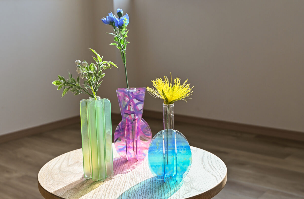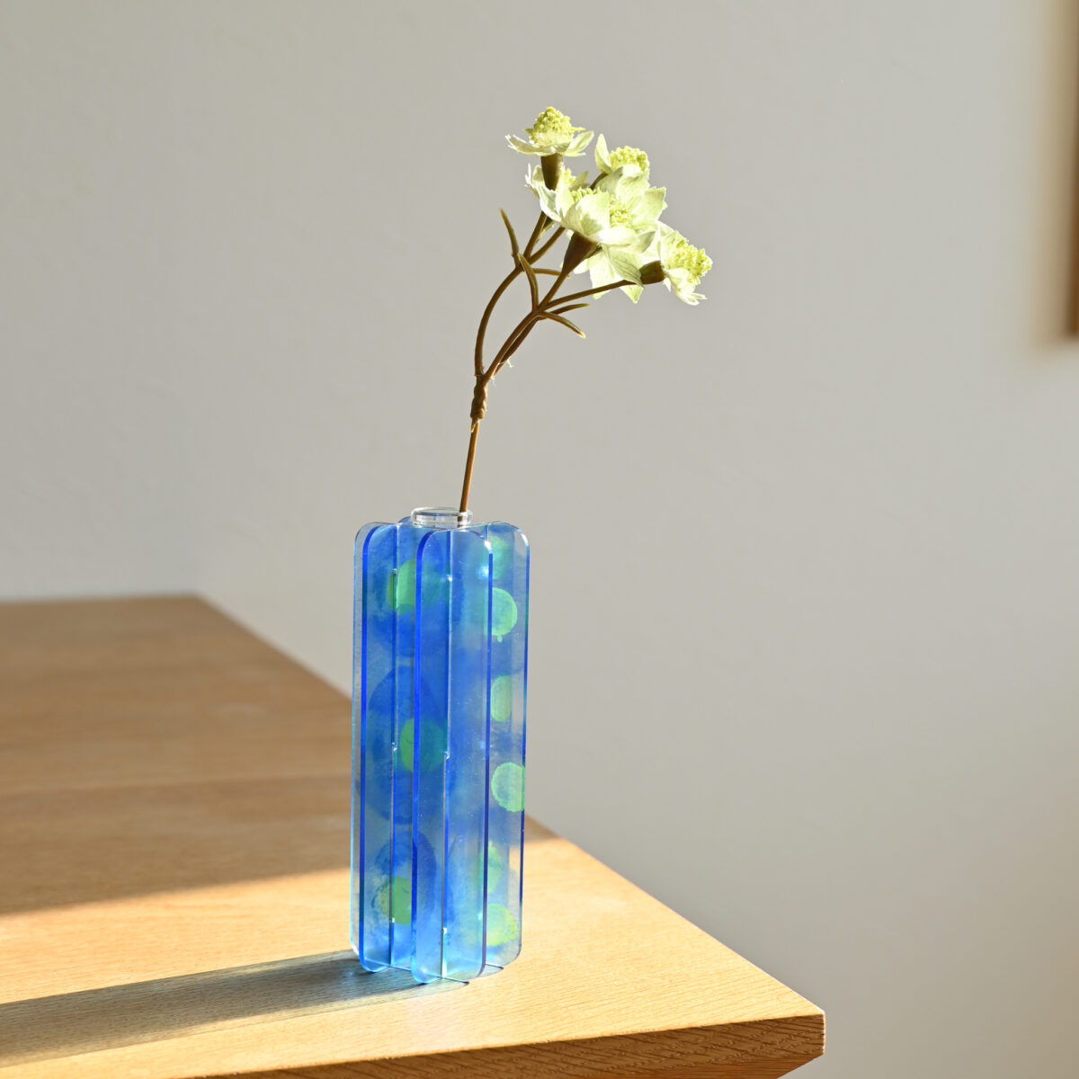 アクリルを使った珍しい一輪挿しは、額装屋が端材を使ってプロダクトに落とし込んだ、サステナブルなアイテムです。中に試験管を入れて使う、ユニークさも魅力。ガラスのフラワーベースも様々なサイズ展開でご用意しています。気軽に飾れるフェイクグリーンも。