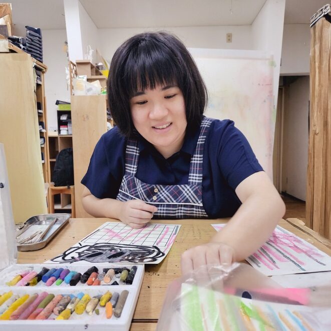 海の生き物が好きで、いつも笑顔で元気なりね。机に向かうと一変、職人のような集中力で、作品を仕上げていく。枝分かれする線と塗り込むようなパステルのタッチ。使い終えたパステルを紙の余白に何度も擦ってきれいにして戻すのも、彼女の大切な流儀。