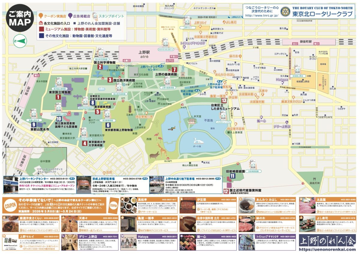 上野エリアでは、5月18日の “国際博物館の日” にちなみ、上野恩賜公園周辺にある博物館や美術館、動物園など 13 施設と、上野のれん会の加盟店が協力し、「上野ミュージアムウィーク」が開催されます。今年も昨年に続き大好評でしたデジタルスタンプラリーが継続して行われ、まちでも多くの展覧会が開催されるなどより一層魅力的なスペシャルウィークとなります。毎年恒例の “まちのお楽しみ” クーポンと合わせ、上野全体が文化のドキドキワクワクに満ち溢れたテーマパークになる特別な時間、ぜひフルにお楽しみください。
