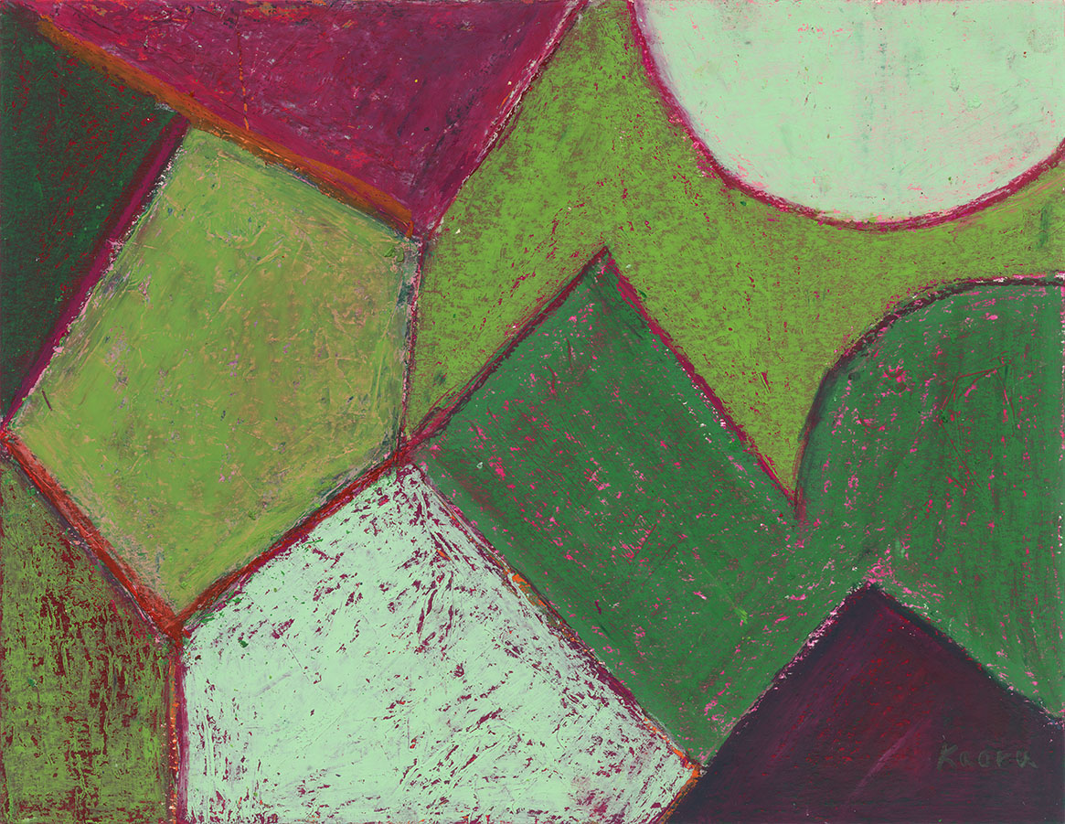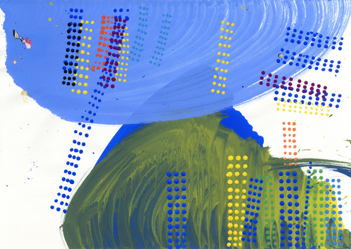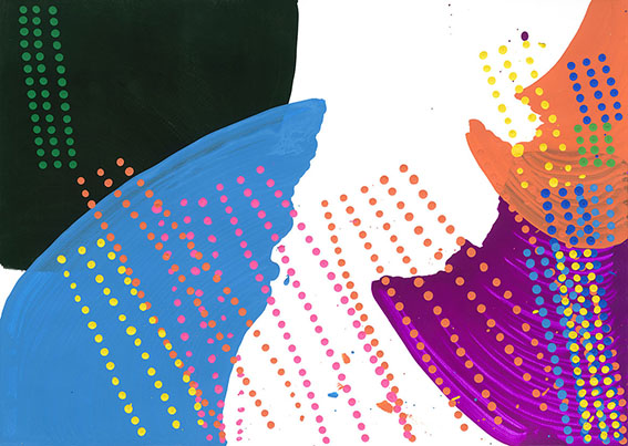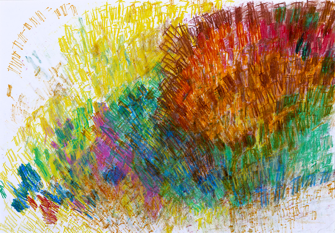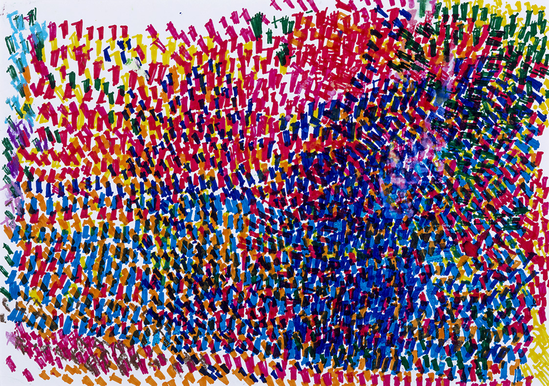 様々な色でいくつも描かれた扇形と点の模様。筆の動きや点の打ち方は規則正しく、同じ動作をゆっくりと繰り返す。気になる事がなく気持ちが穏やかな時ほど、きれいな筆使い、整列された『点』になるよう3列に描かれていく。イメージしているものがあるのか、色や動きを楽しまれているのか、何を感じて描いているのかは彼にしか分からない。
