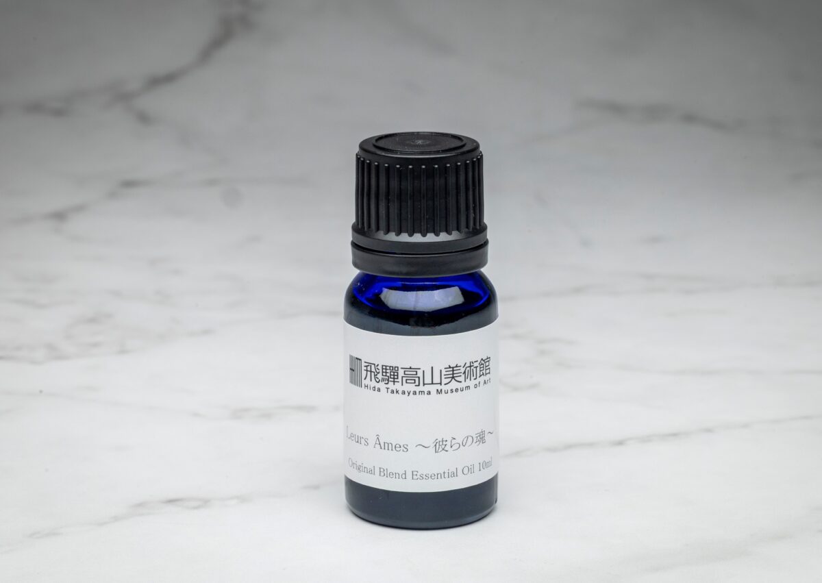 香りは、ふとした瞬間に情景や感情を呼び起こし、館内で感じた静けさや光の移ろい、作品と向き合った時間を、日常の中で静かによみがえらせます。本オリジナルアロマオイルは、当館収蔵作品のひとつであるルネ・ラリックによる香水瓶《彼らの魂(Leurs Âmes)》から着想を得て開発されました。本作は1913年、ラリックがドルセー社のために手がけた香水瓶で、花綱で結ばれた2人の裸婦は愛と魂の結合を象徴し、香りの世界観をガラスに昇華した逸品。現存する唯一の完全オリジナルセットとして極めて貴重な作品です。約100年前の香りに近づけ、現代によみがえらせたオリジナルブレンドは、作品が内包する時間や気配を、香りとして体験いただけるものです。