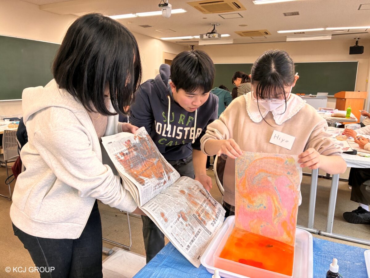 秋本 瑠理子氏を講師に迎え、本格的なアート技法を習得。スパッタリング(絵具を飛ばす技法)やマーブリング(水面の模様を写し取る技法)などを用いて、担当惑星のポスター制作に加え、「もしこの惑星に生命体がいたら?」というテーマで、自由な発想による生命体制作に取り組みました。プレゼンテーションのスライド作成や進行、模型製作など、メンバー各自の得意分野を活かしながら役割分担を行い、チームワークにより独創的な作品を仕上げました。