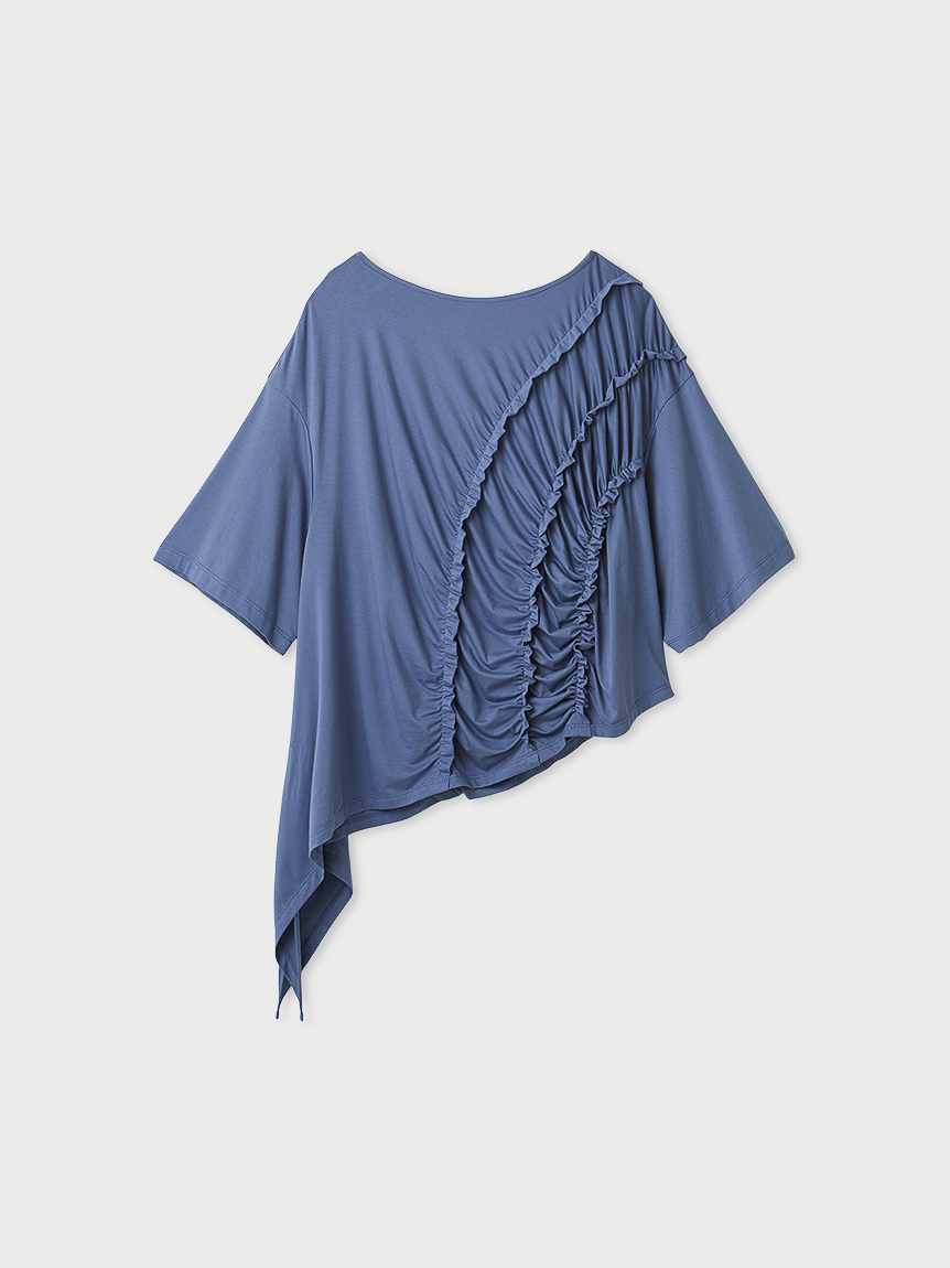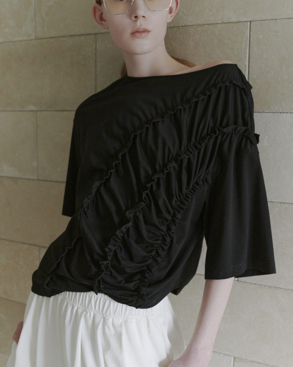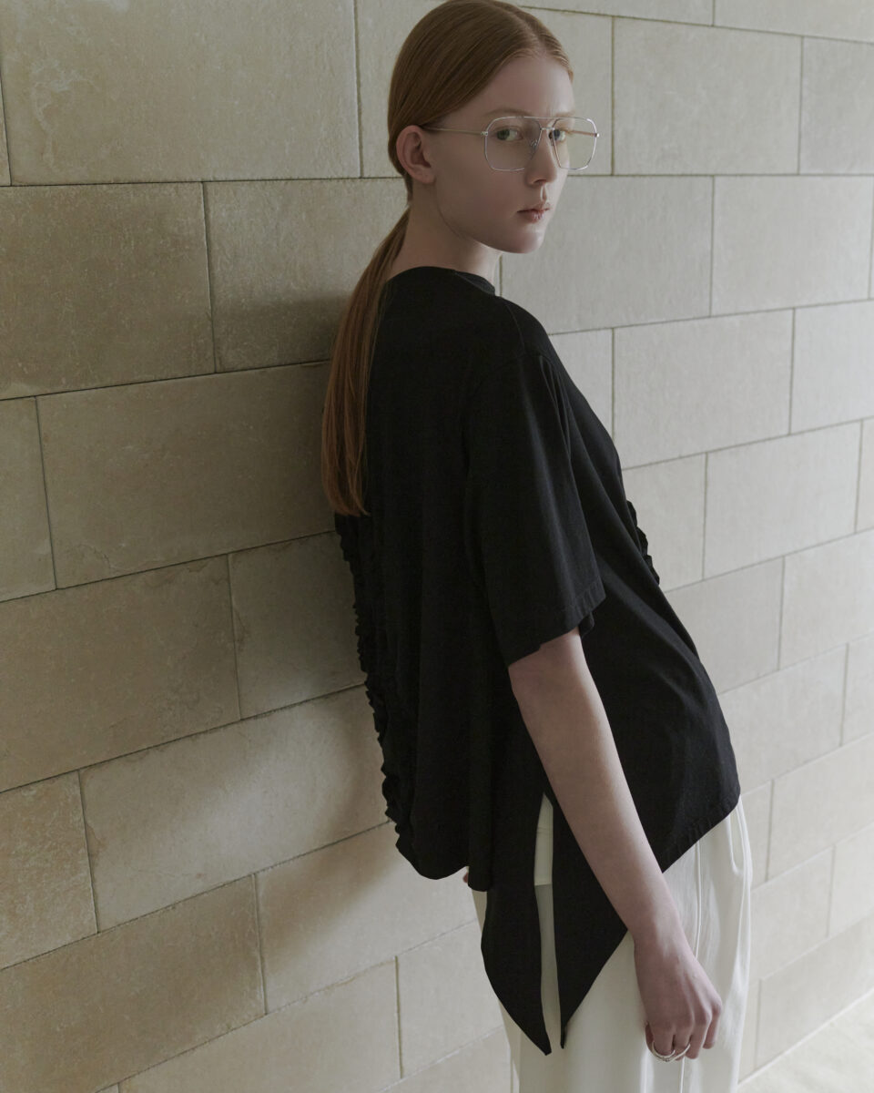 作品から着想を得たエッジのカーブと商品を包む風呂敷のギャザーをシャーリングで表現。