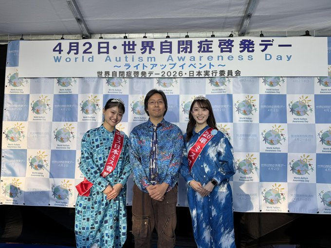 準ミス日本の正木由優(まさきゆゆ)さん、ミス日本ミス着物の平嶋萌宇(ひらしまもね)さんも参加し、自閉症啓発のための漫画や風船を配布しました。自閉症のテーマカラーでもある鮮やかなブルーの衣装は、世界自閉症啓発デーに「Beyond Blue Project」を展開するヘラルボニーの提供です。