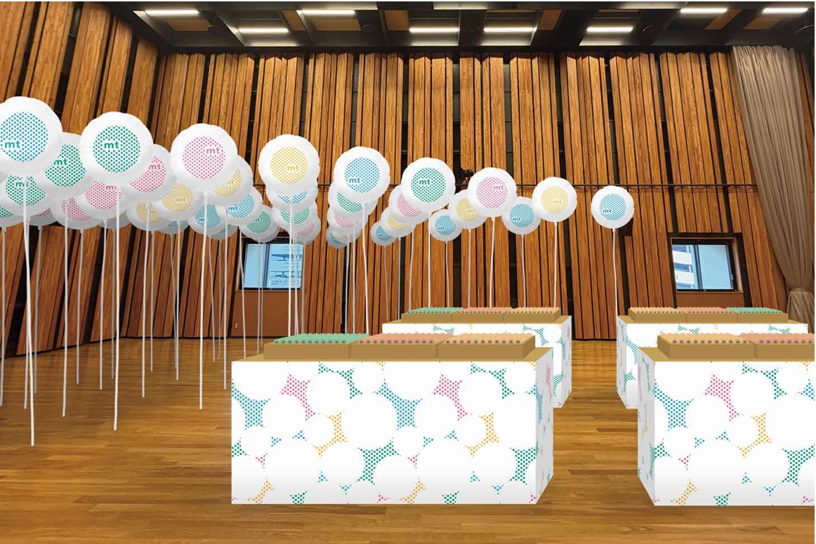 浮遊感のあるmtオリジナルデザインの風船を使ったインスタレーション装飾は、天井高のある会場の空間がよりゆったりと感じられ、初のmt ex展を記念するお祝いムードを華やかに盛り上げます。