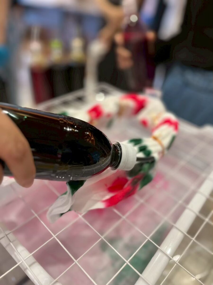 好きな色を2色選んで、いよいよ染色。白い布に鮮やかな色が染み込んでいく瞬間は、まるで魔法を見ているみたい!