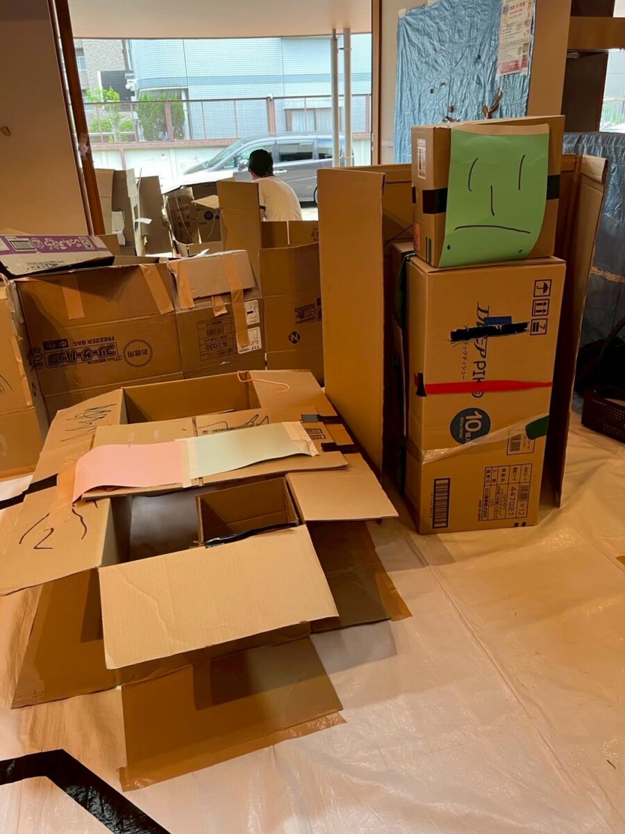 たくさんのダンボール、ガムテープ、ハサミ、カッター、マジック