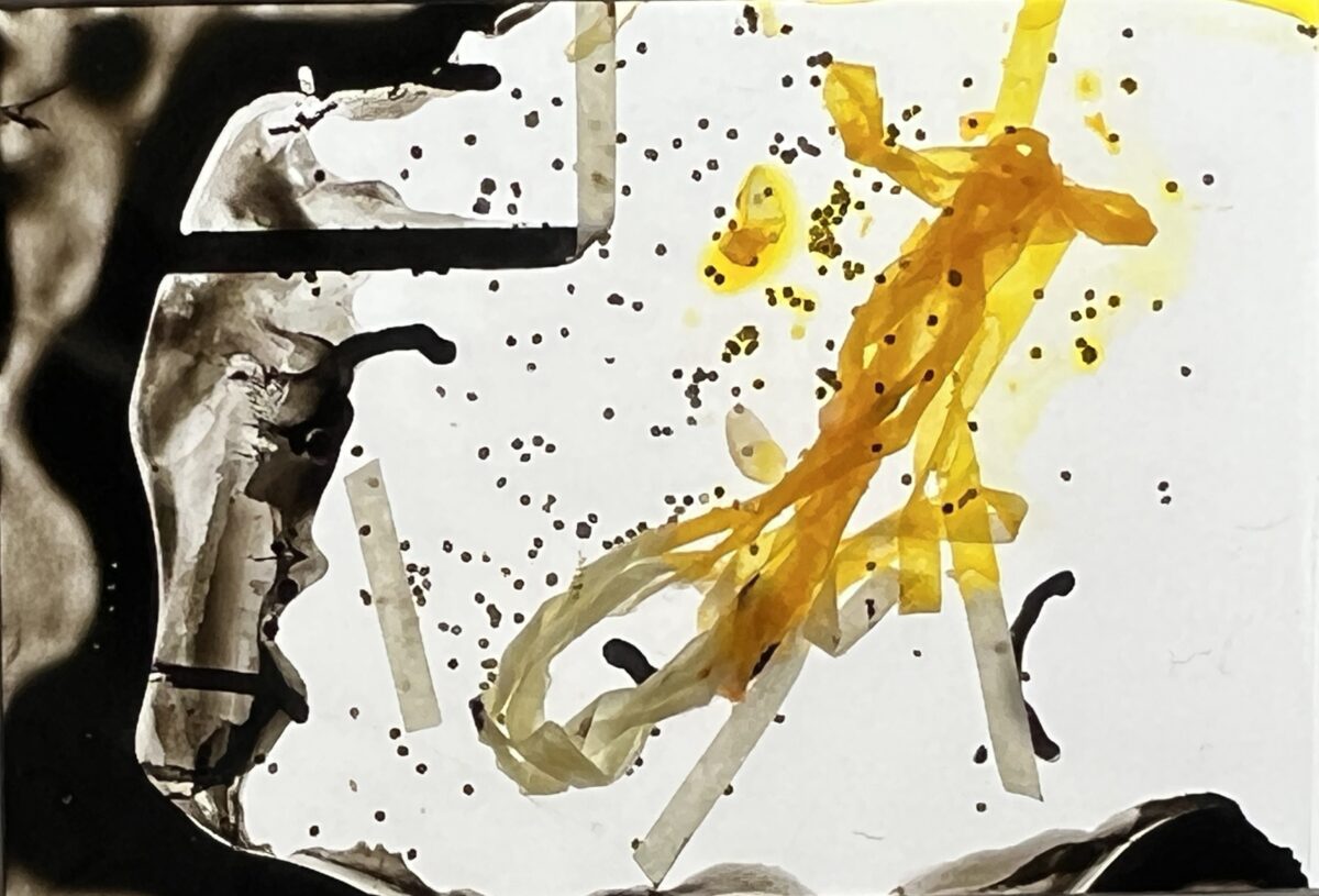 机の上にある紙やテープ、葉っぱやタネなどを、光と影を強調してみたら、どう見えるでしょうか?