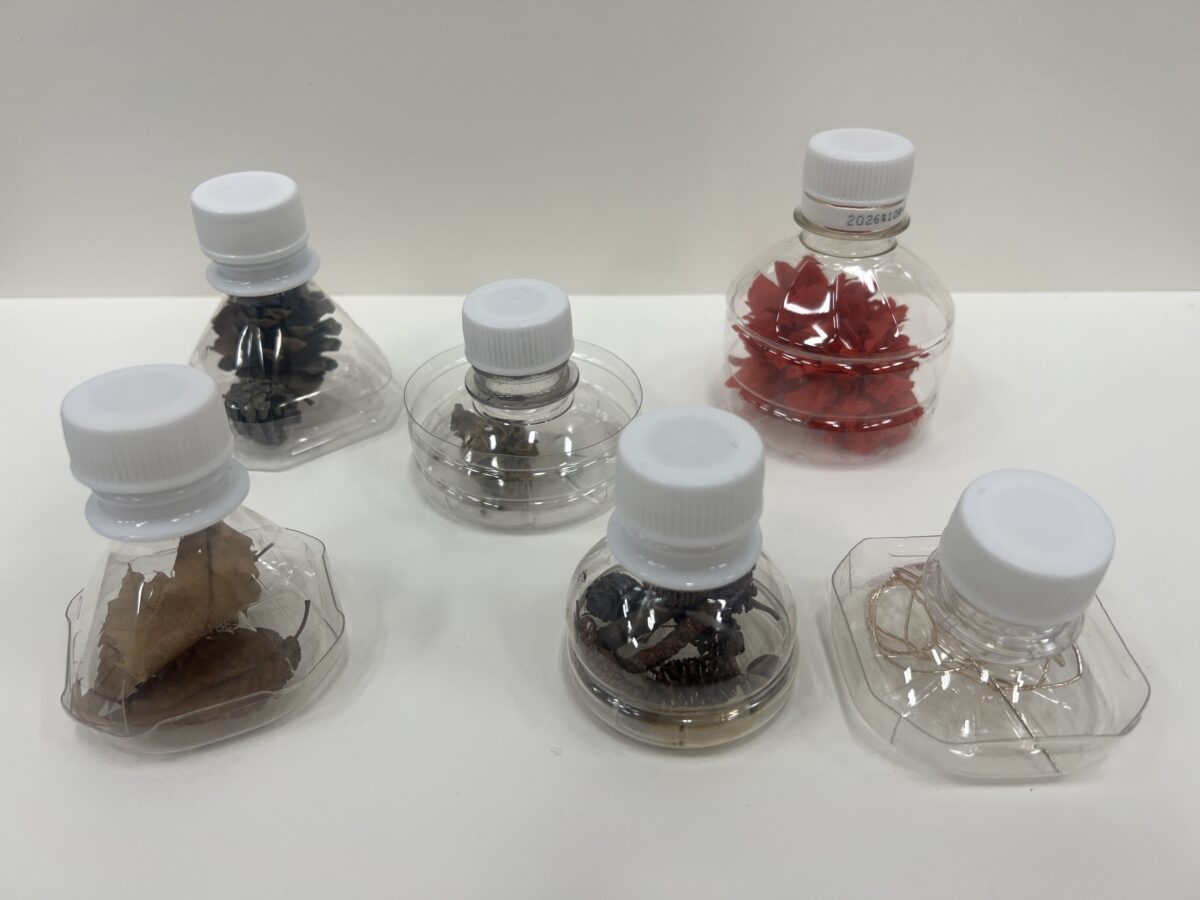 お気に入りの小物、公園で拾った石や植物など、皆さんの宝物をペットボトルの標本瓶にセットしていきます。みんなの「大切」「美しい」「集めたい」を、見比べてみましょう。