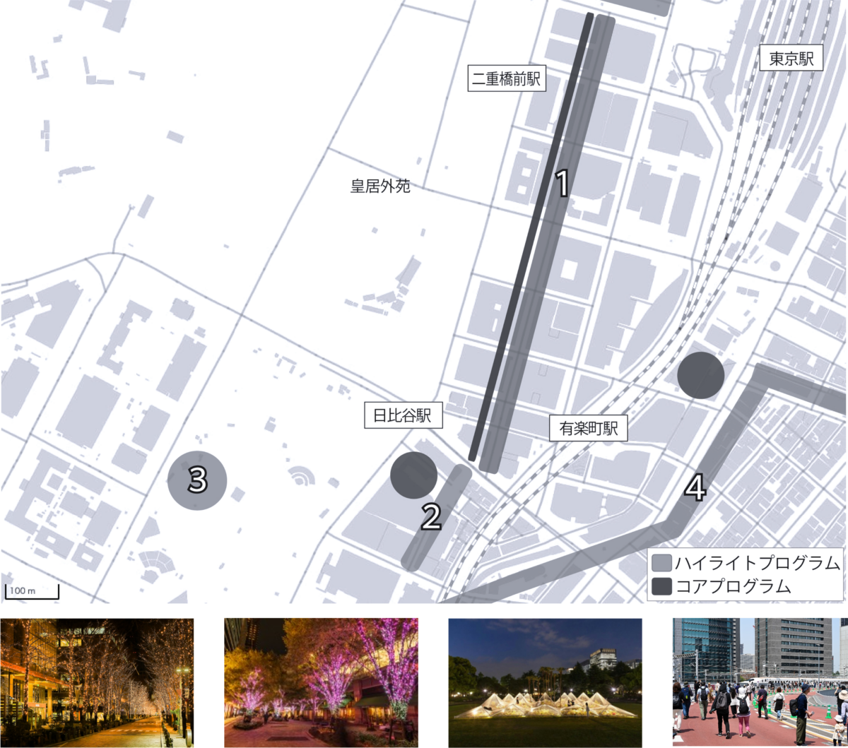 丸の内から有楽町、日比谷へと連なるストリートに広がる、イルミネーションの煌めき。日比谷公園やKK線(東京高速道路)で展開されるアートや文化芸術プログラムと響き合い、特別な体験がエリア全体へとにじみ出ていきます。