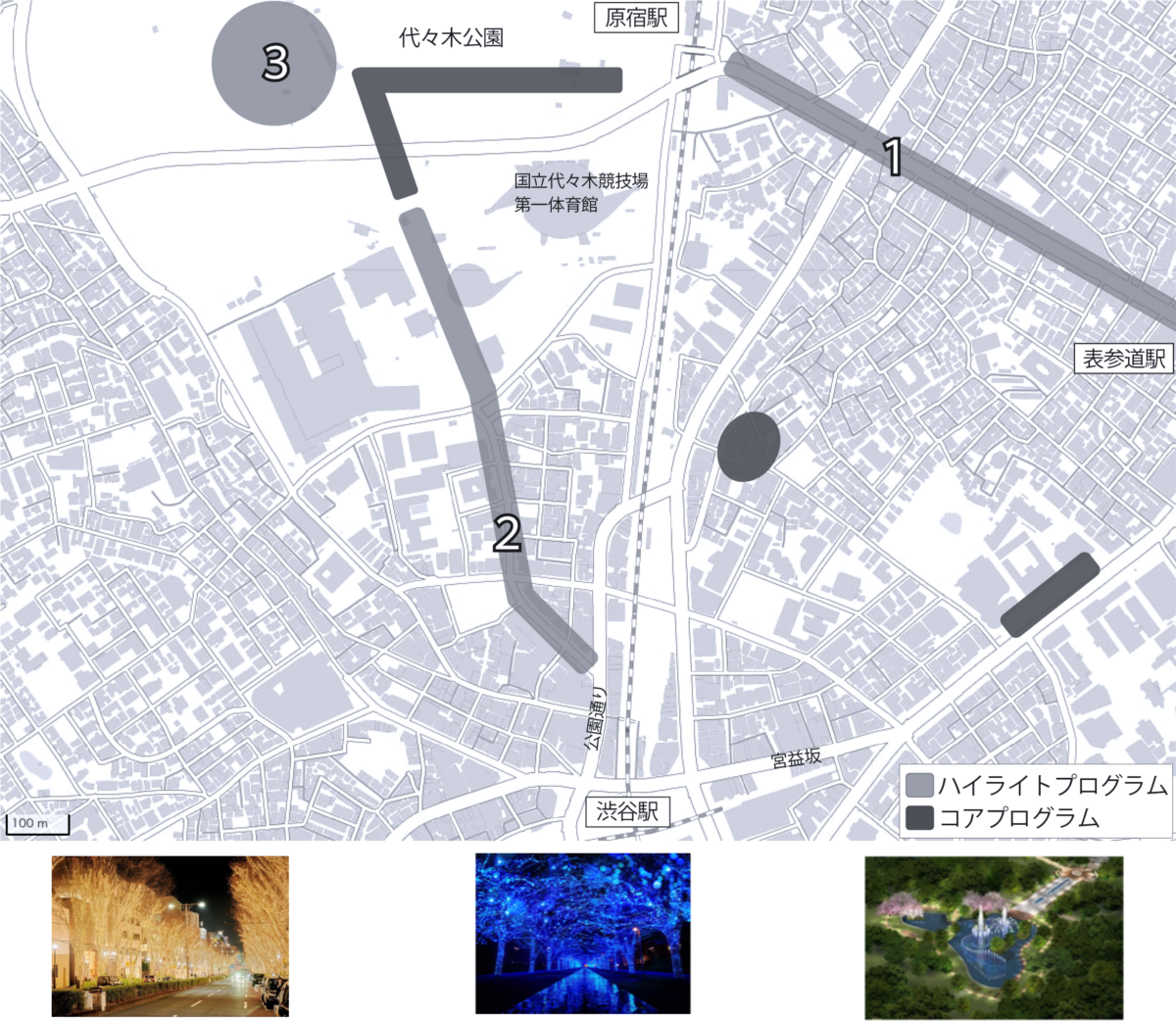 開催コアエリア 臨海エリア、日比谷・丸の内エリア、代々木・渋谷エリア