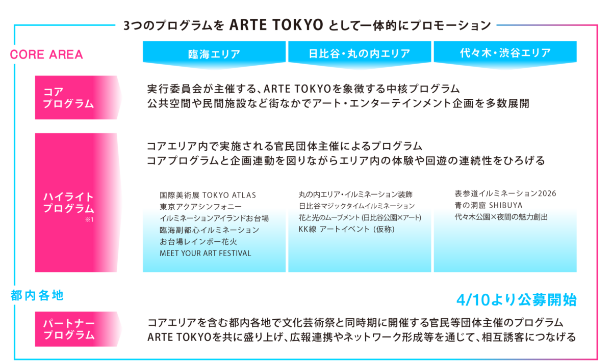 初開催となる2026年は、臨海エリア、日比谷・丸の内エリア、代々木・渋谷エリアをコアエリアに、様々な催しと連動しながら、公園や水辺などの街なかで東京2020大会文化プログラムのリバイバルをはじめとする多数のアートやエンターテインメント企画を展開します。