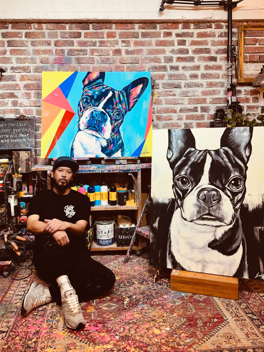 20代の頃、ニューヨークやロサンゼルスのストリートアートに触れ、独自のアートスタイルを確立したEIJI TAMURA DOG ARTは、カラフルでポップなタッチで愛犬たちを描き続けてきました。
