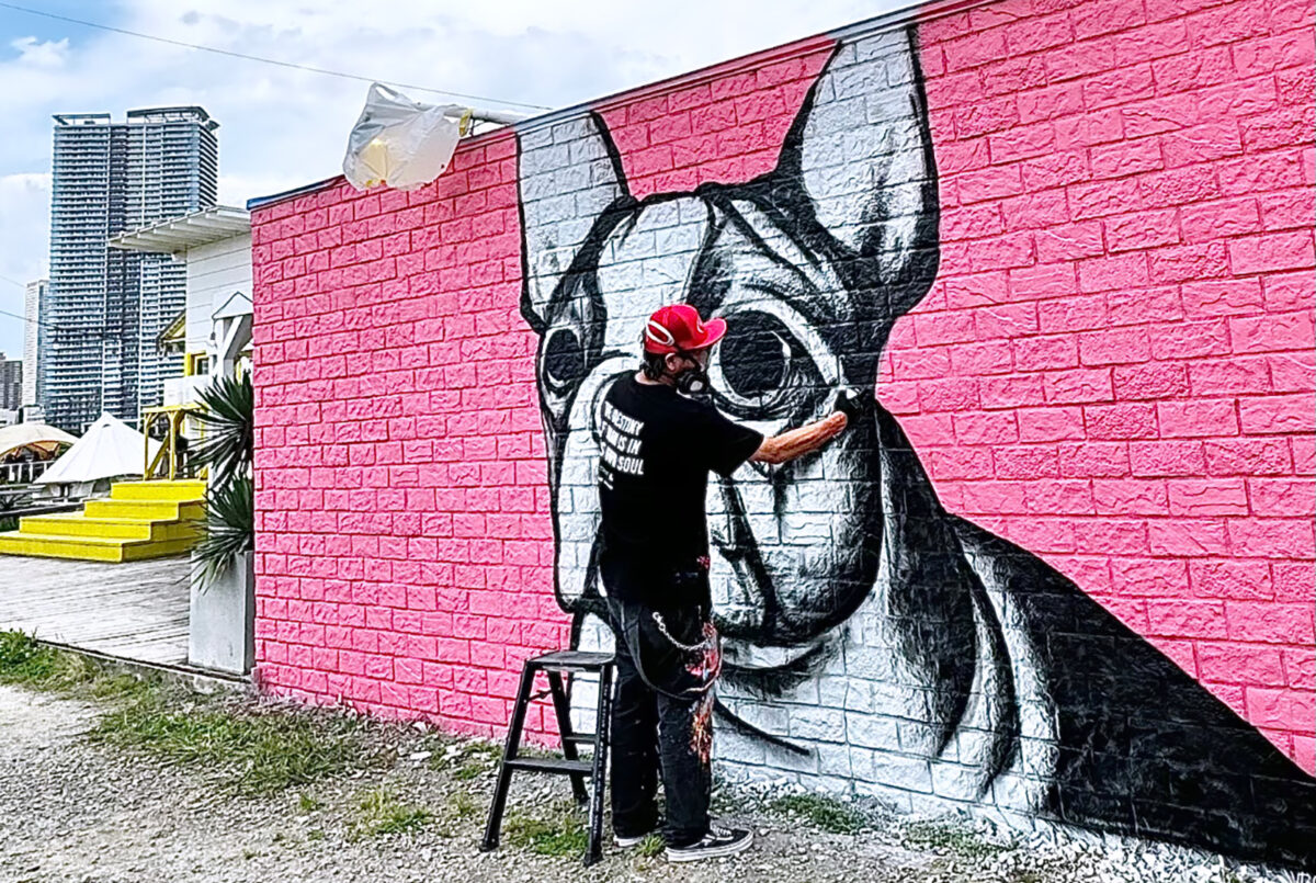 ニューヨークや全国の百貨店、ギャラリーで個展を開催し、日本各地のカフェやインテリアショップでウォールアートを手がけるなど、EIJI TAMURA DOG ARTの作品は街中で広く親しまれています。